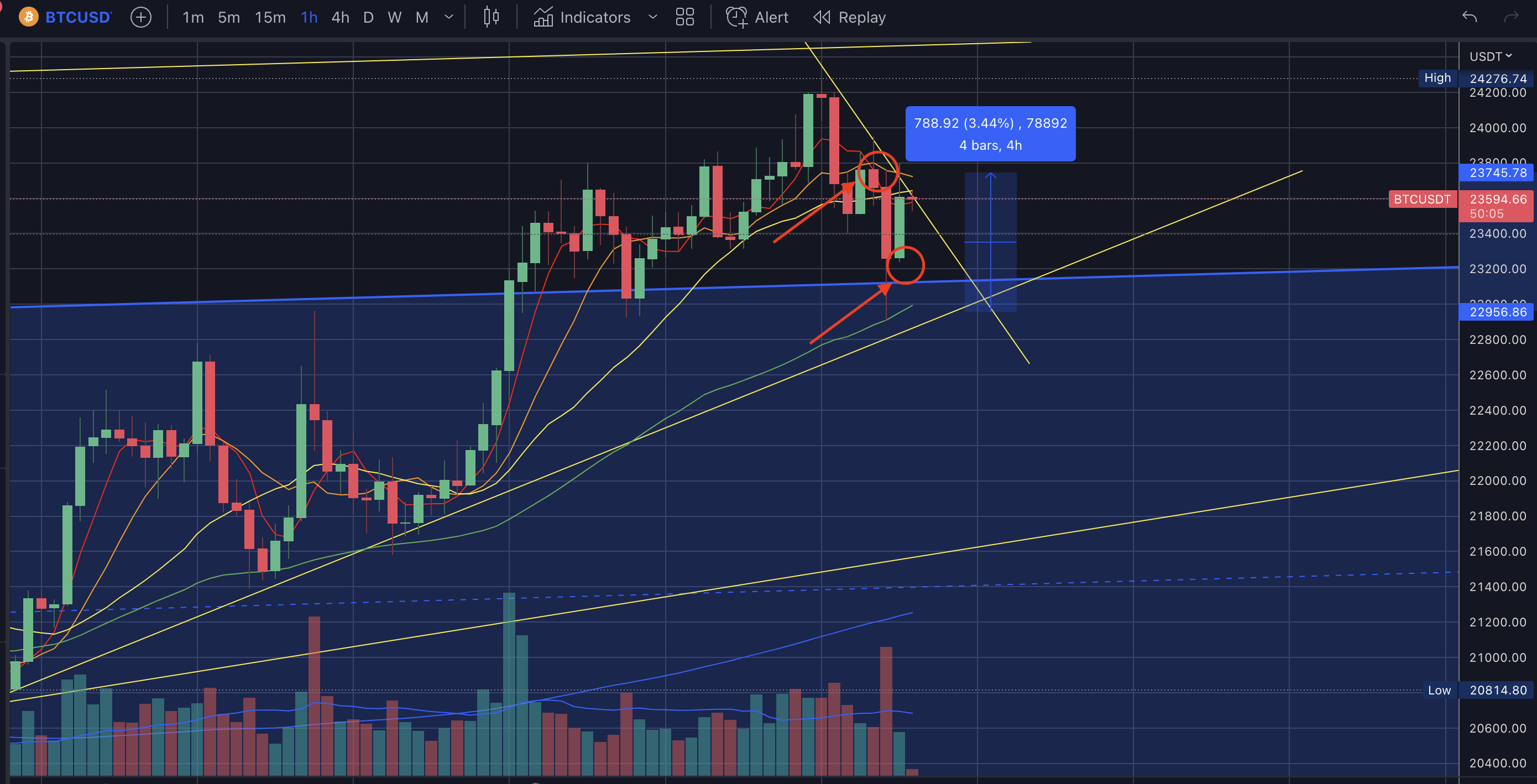 - 거래량도 좋고 채널도 뚫었으나 머스크가 비트코인을 파는 바람에 채널상단까지 왔으나 다시 회복해주면서 `23.5`를 회복해 주고 있다.
