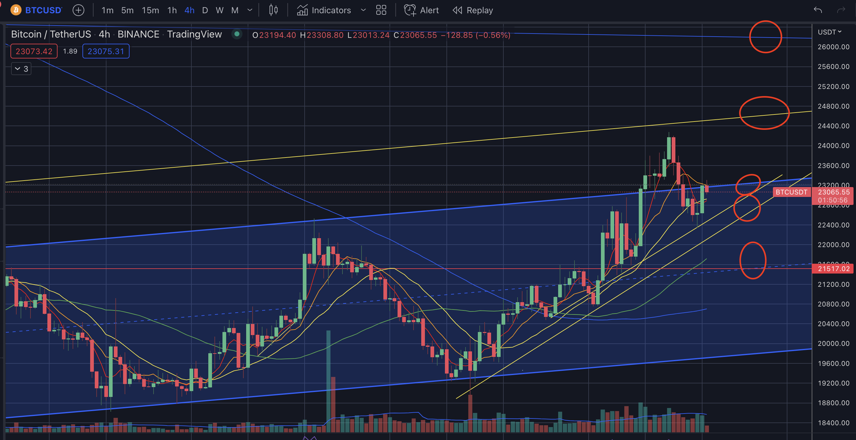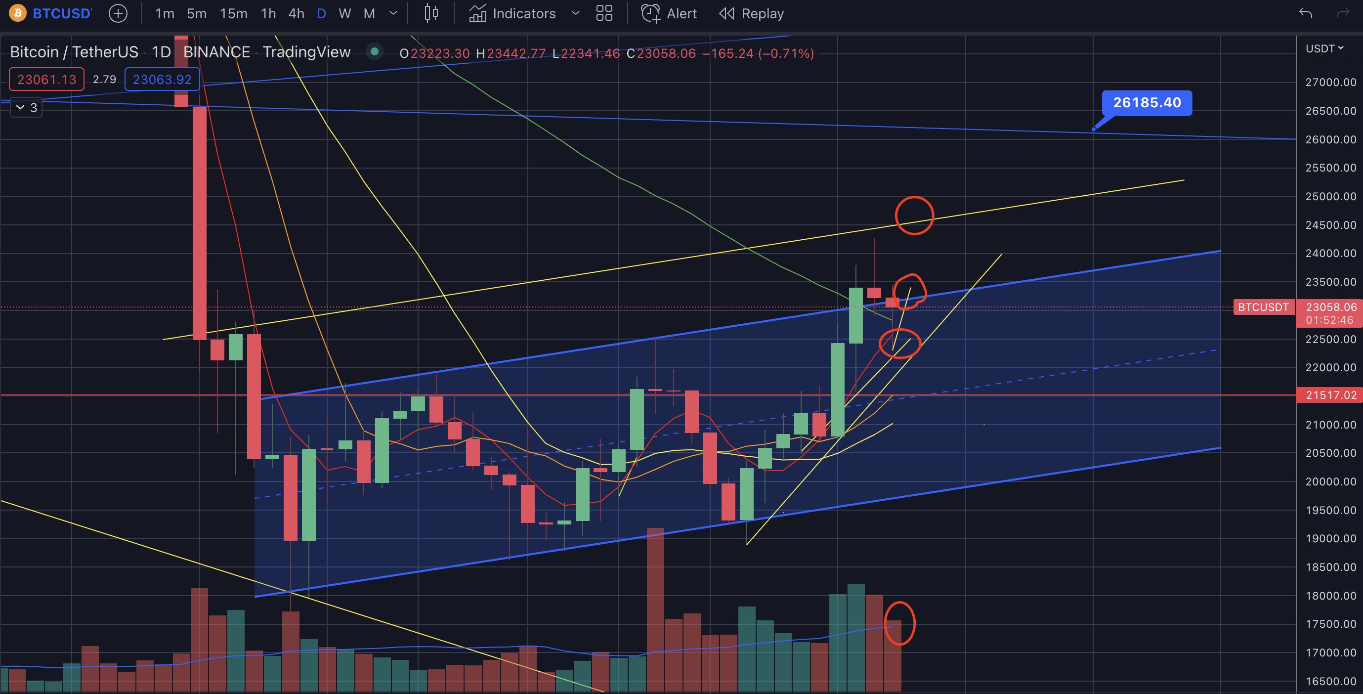 23.2를 강하게 뚫고 양봉으로 마감해주면 윗추세선25k라인까지 가능하다.