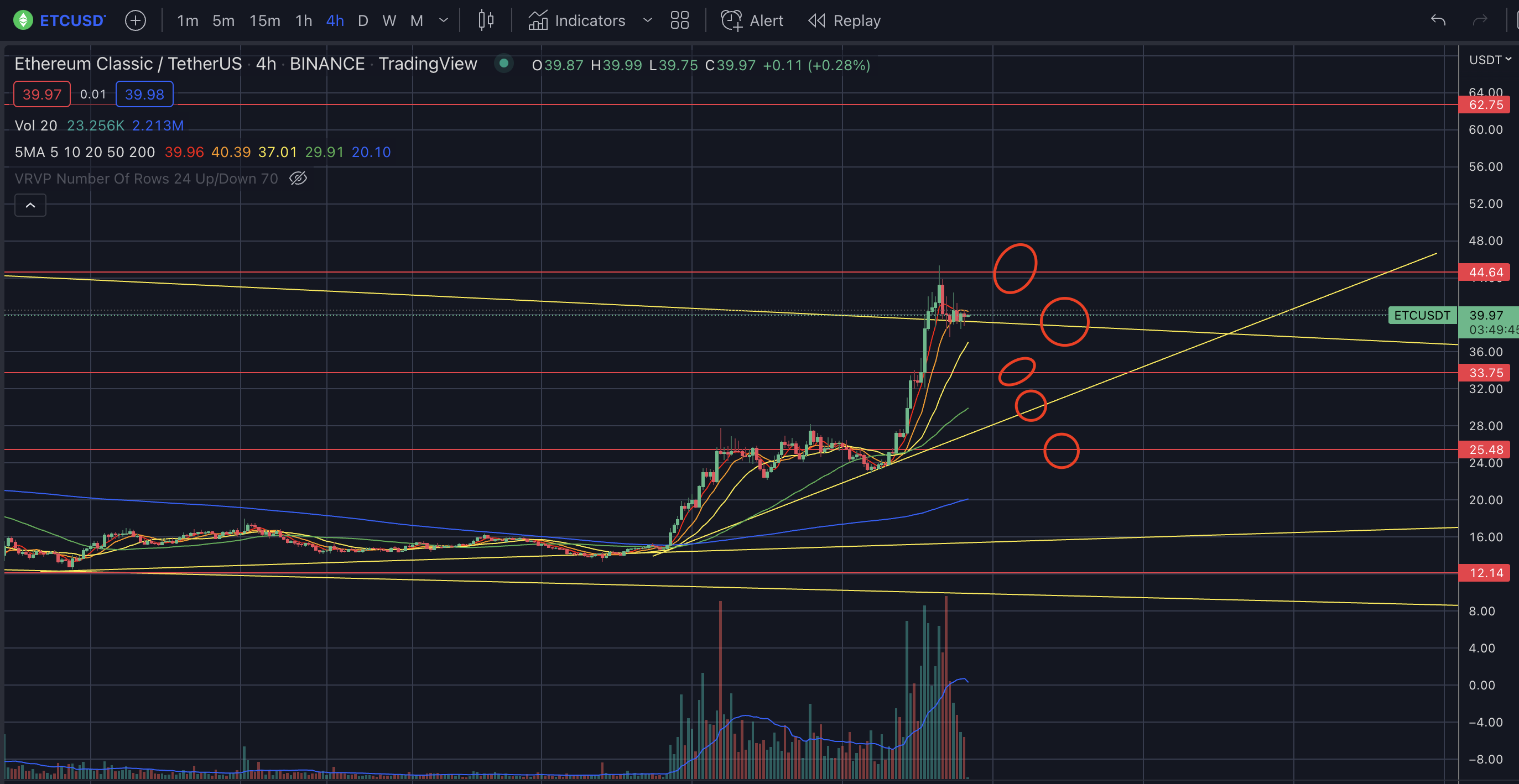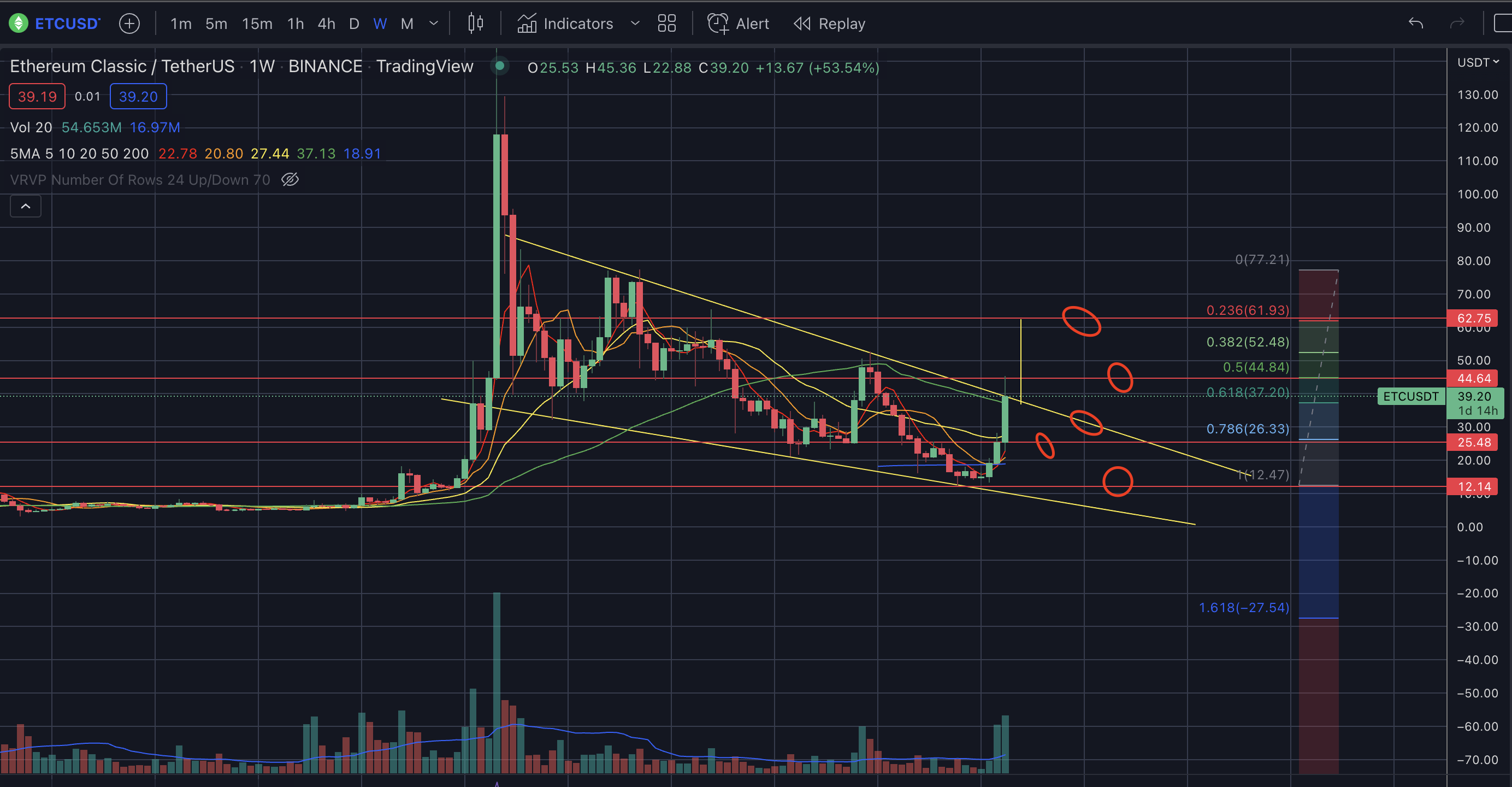 하락쐐기형상단 부근인데39~40근처에서 비벼주면62부근까지 상승이 가능하다. - 하지만 20일선을