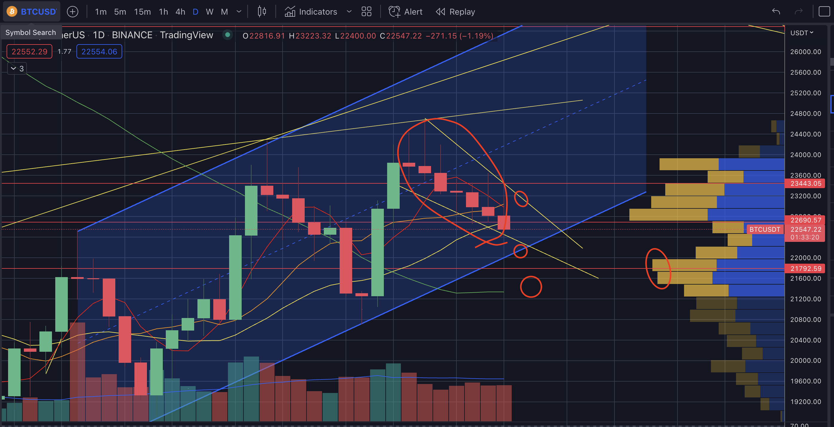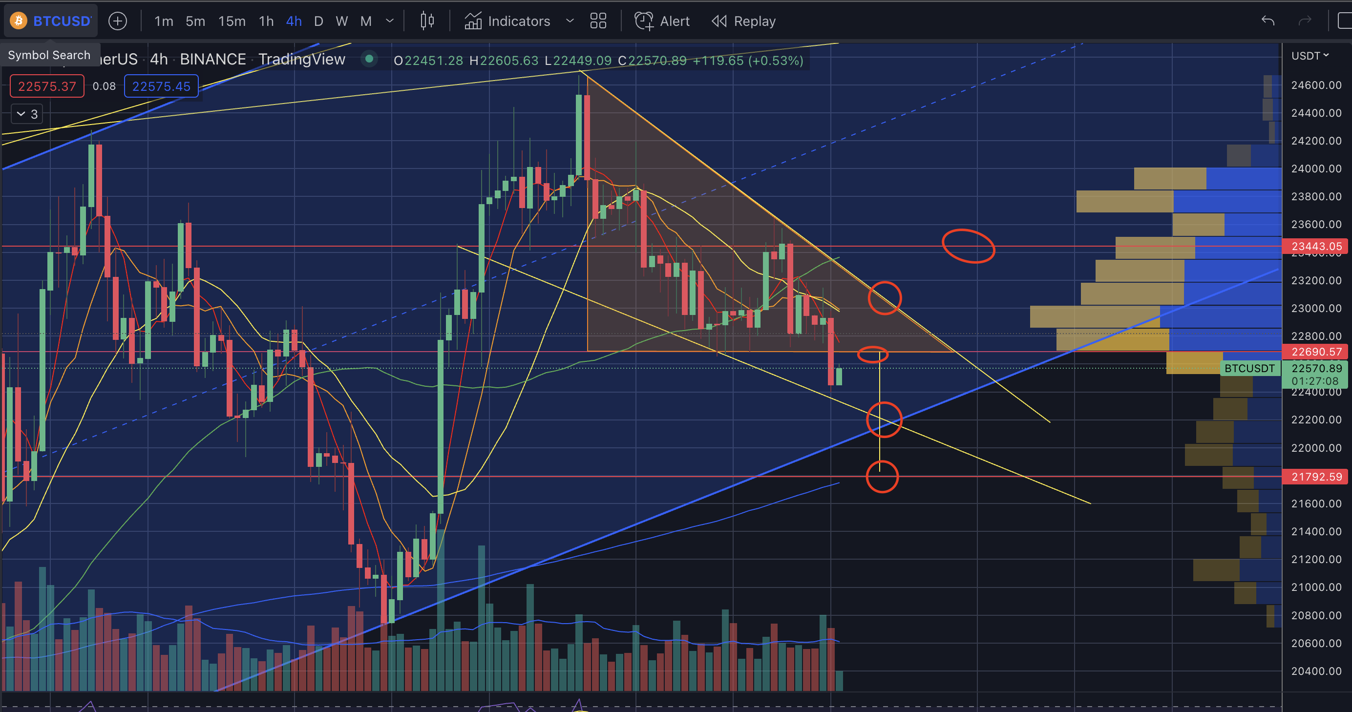 22.7을 강하게 뚫어주지 못할 경우 튕겨나와서22.1~2-->21.7까지 가능하다. - 옆에 매물대를 보시다시피 이제 매물대가 거의 없어서 4시간봉,일봉이 매물대를 뚫어주지 않으면 힘든 상황이다.