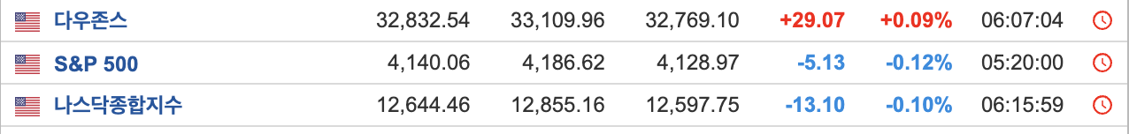- 3대 지수 모두 큰변화가 없어 보이나 장초반 상승 후 하락이여서 좋지 않은 장 마감이다.