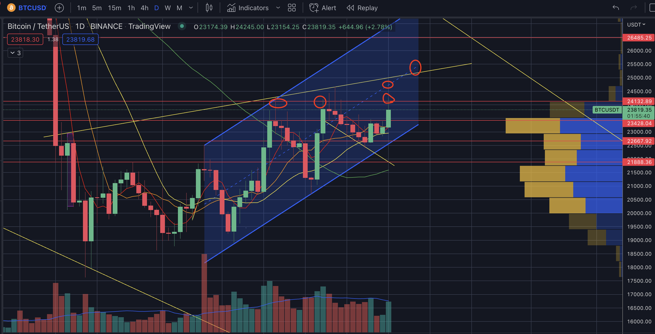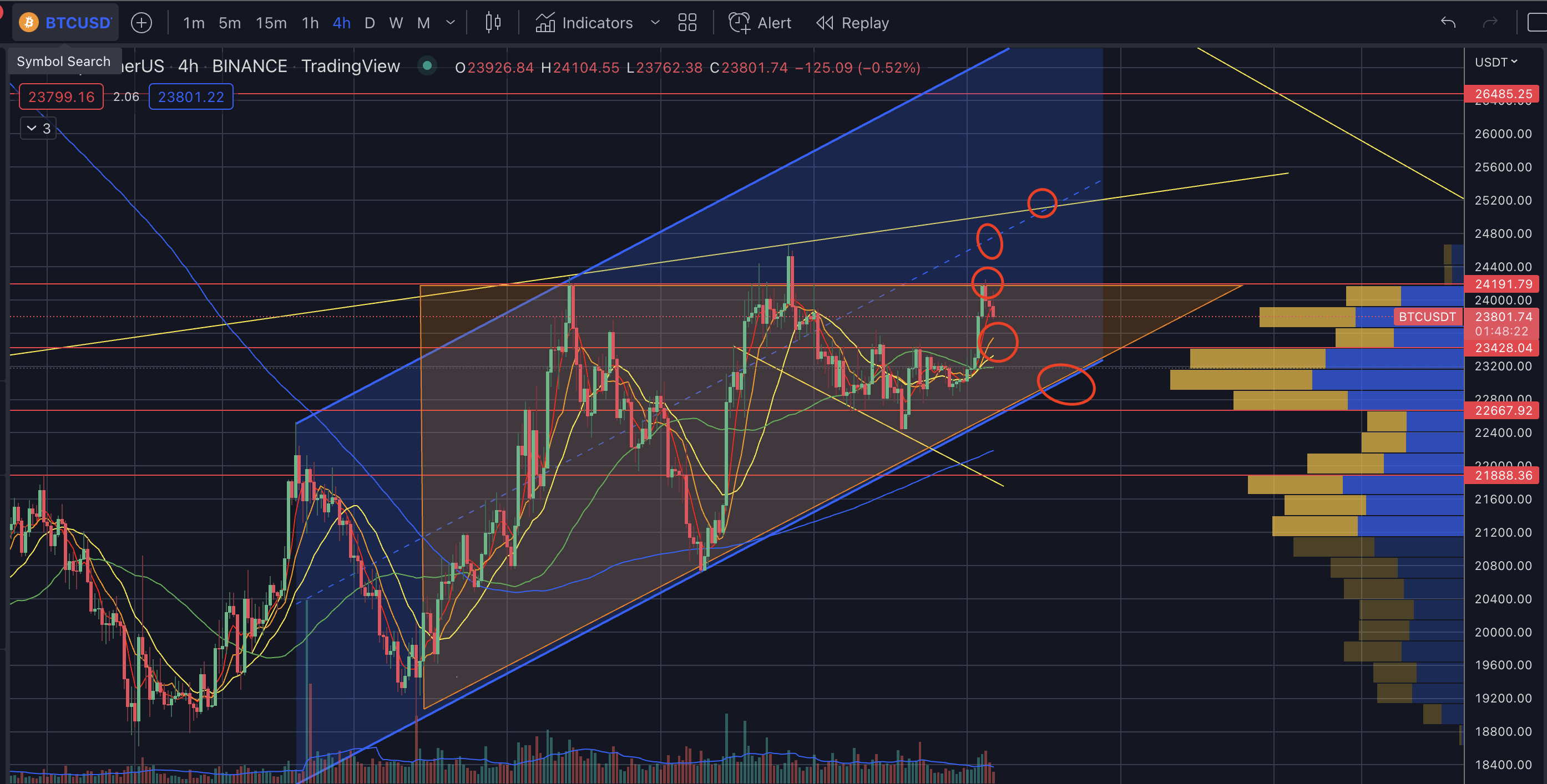 23.4를 깨버리게 되면 이번 상승은 눌림목이 아니라 하락의 초입으로 볼 수 있다. 23.4를 지켜주고 다시 한번 트라이를 한다면 전고점을 뚫을 수 있고25~26까지 가능하다.- 상승시 저항 구간 :