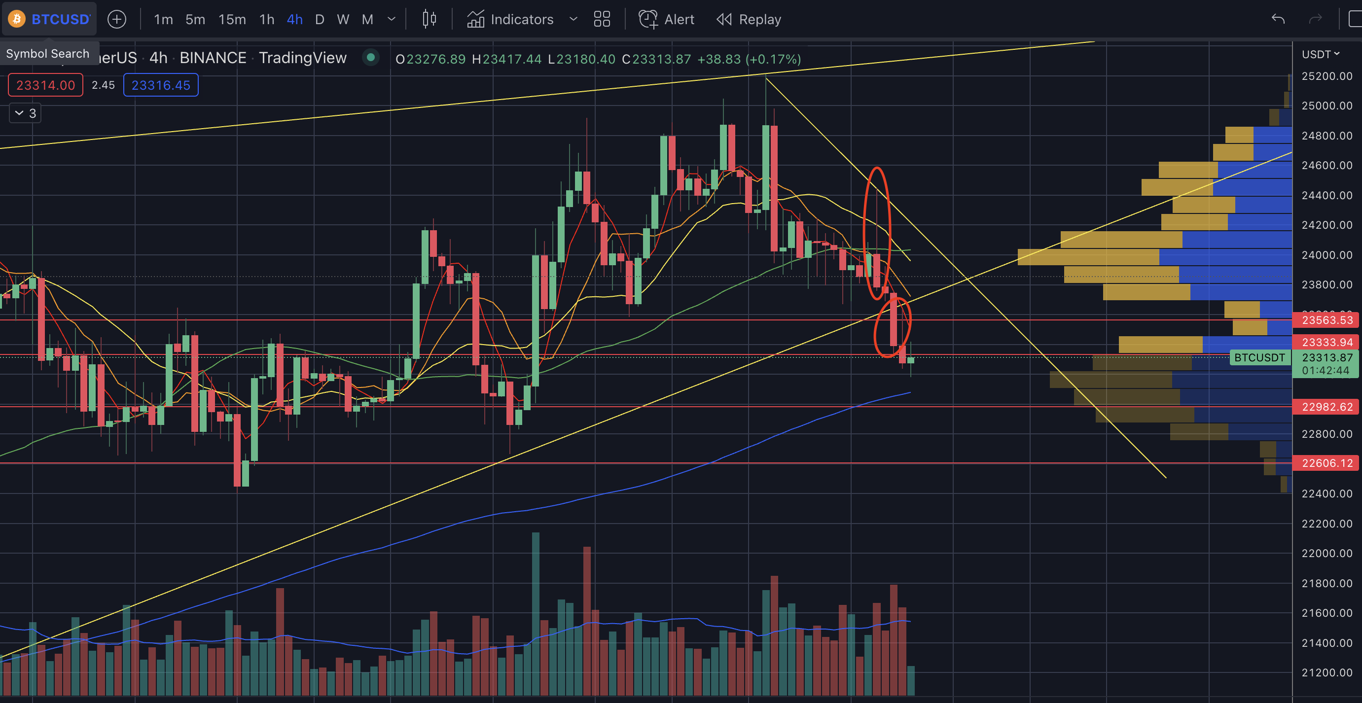 23.4까지 올라가면서 추세가 바뀌려나 했지만 윗꼬리를 달면서 좋지 않은 봉모양을 보였다. 이건 큰 하락의 전초였다. - 어제 21시 부근에서 강하게 뚫고 추세선을 떨구면서 안좋은 모습을 보였다.