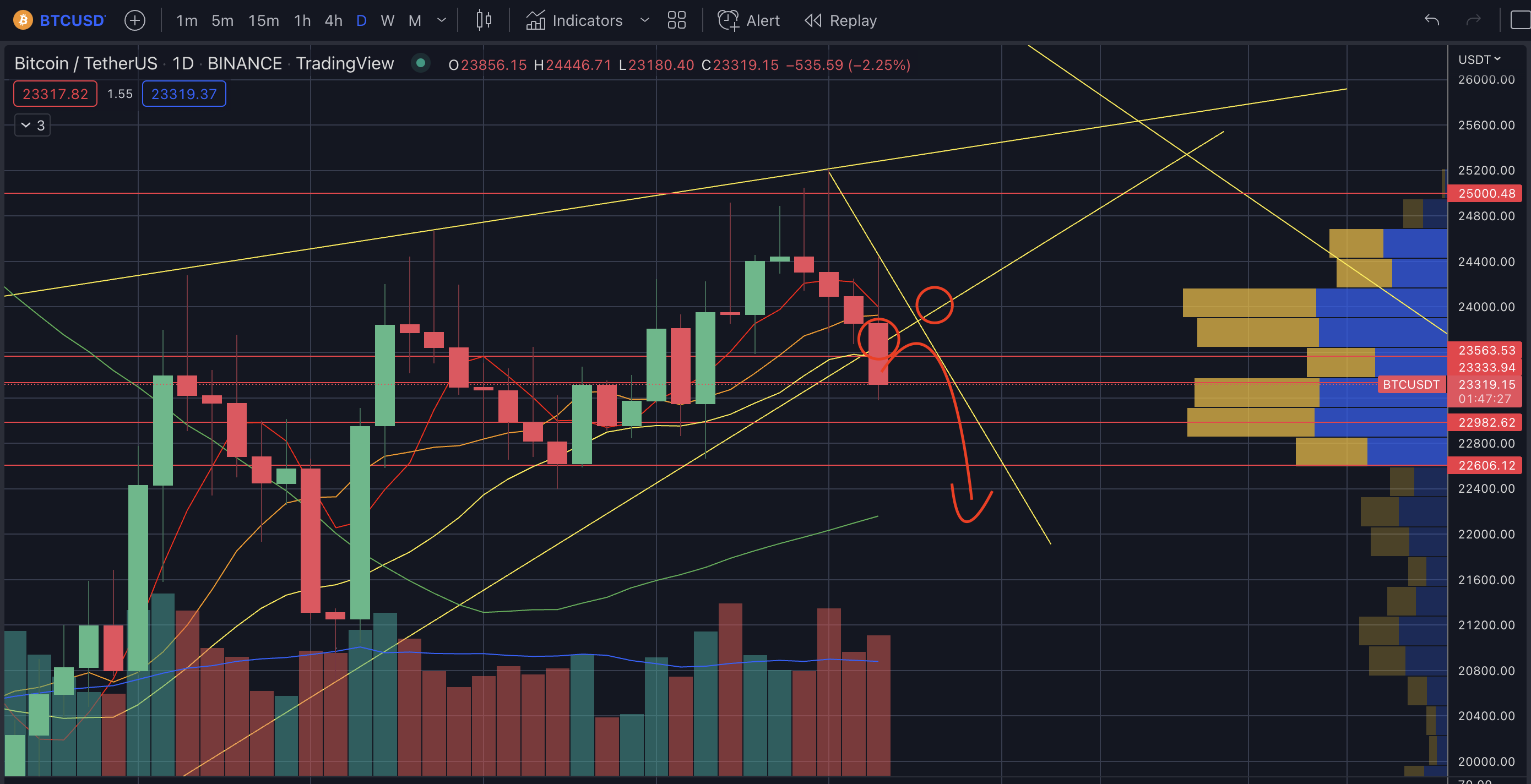 23.5를 깨버리고 말았다. - 일봉이 아직 마감되진 않았지만 추세선을 뚫는 음봉으로 나올 가능성이 많아졌다.