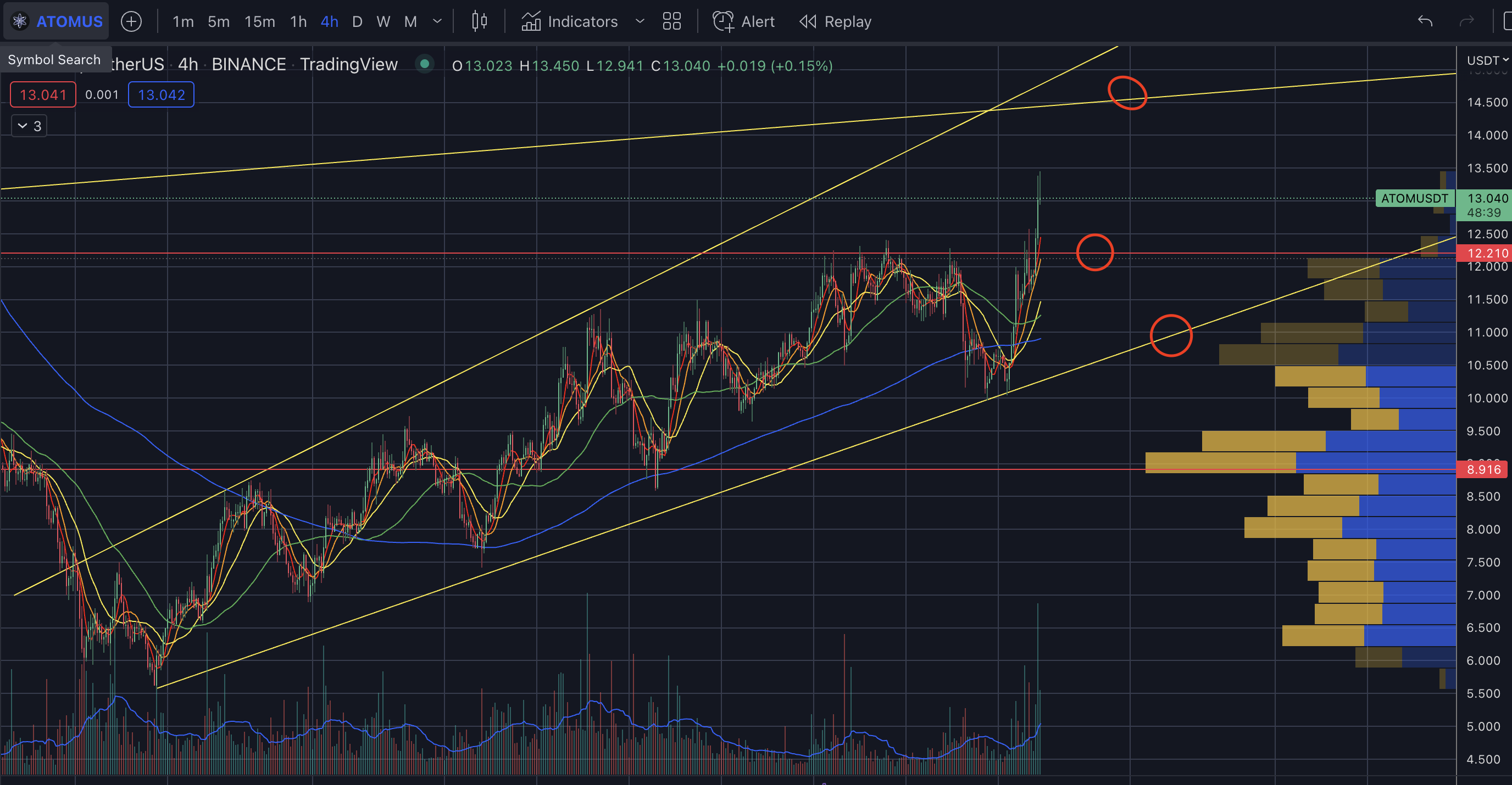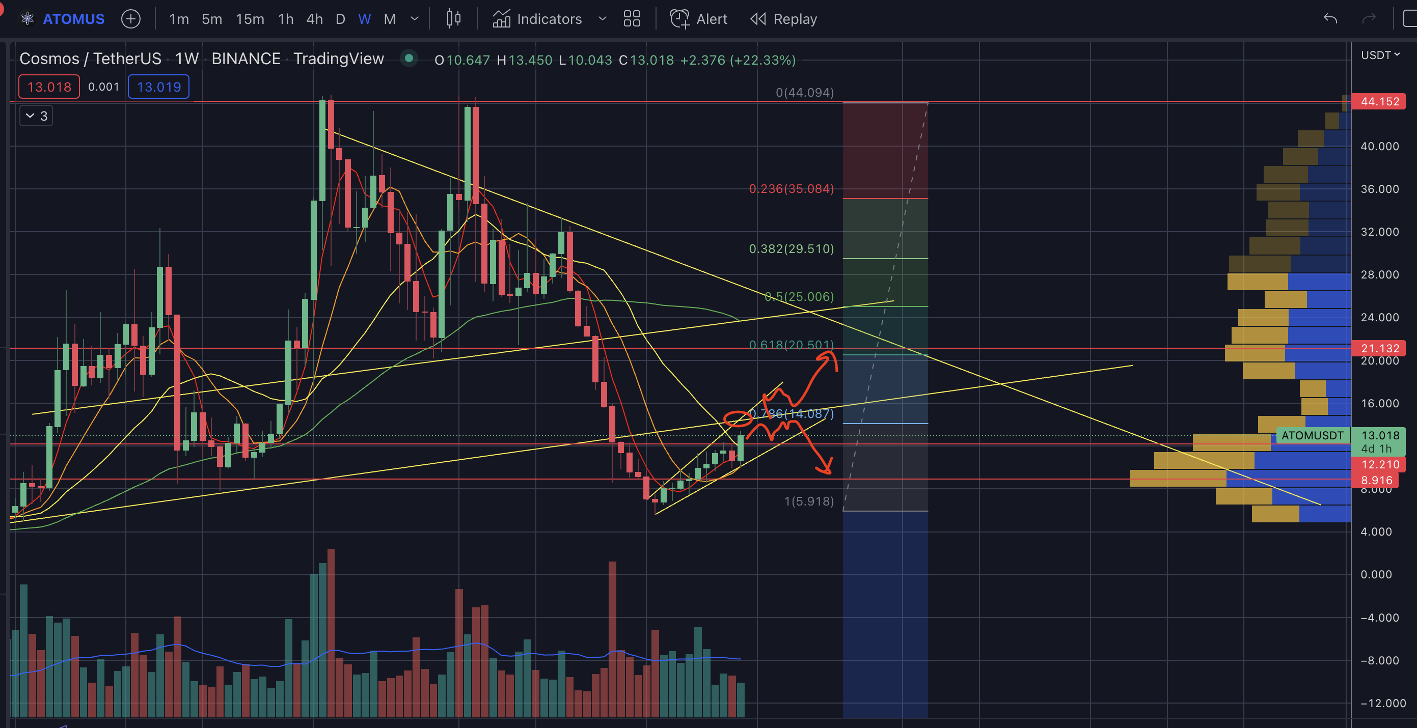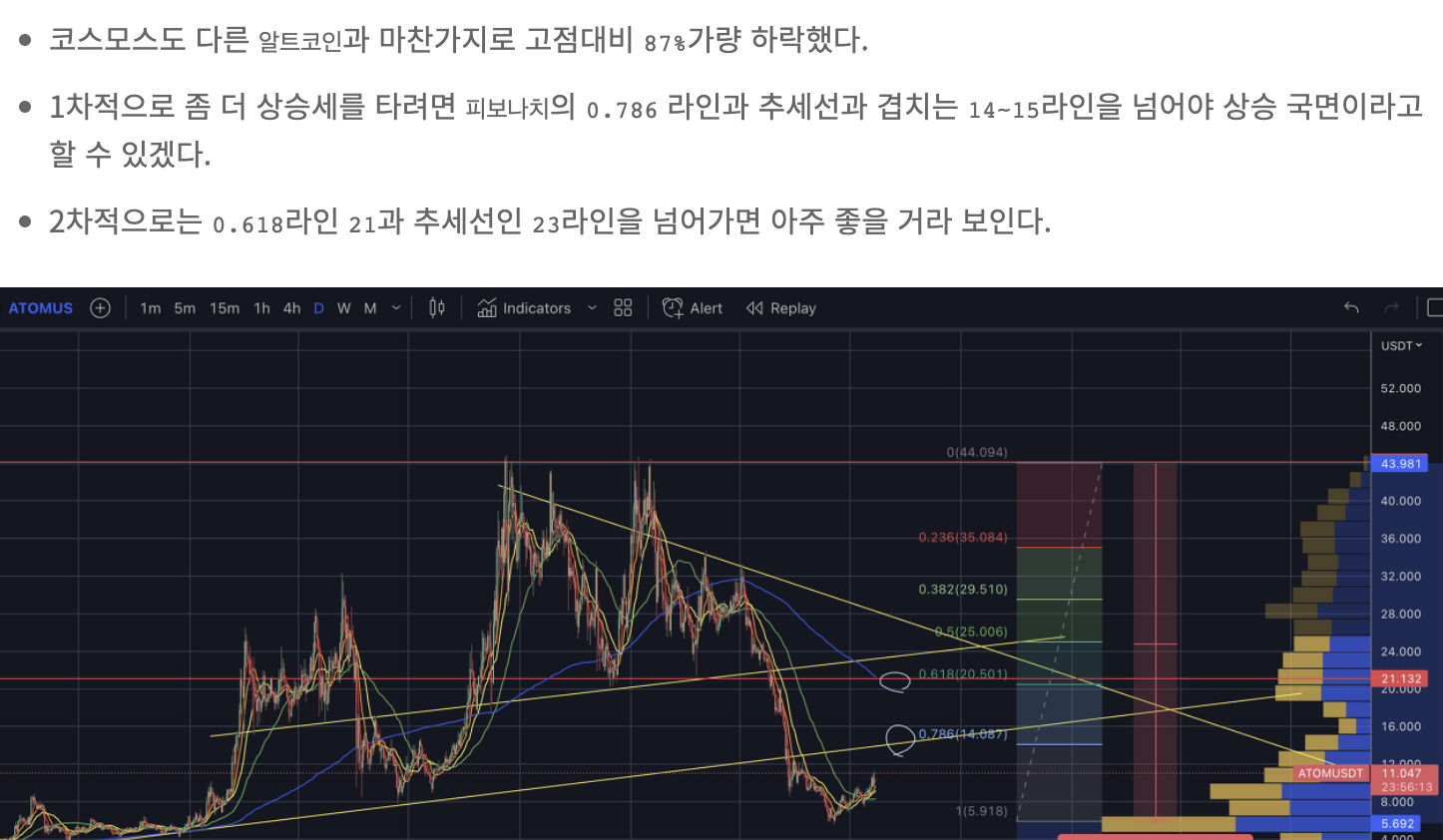 - 큰 추세선과 피보나치 0.786선이 만나는 14부근이 강력한 저항점이 될 예정이며 돌파한다면 매물대가 없어서 쭉 오를 수 있다.