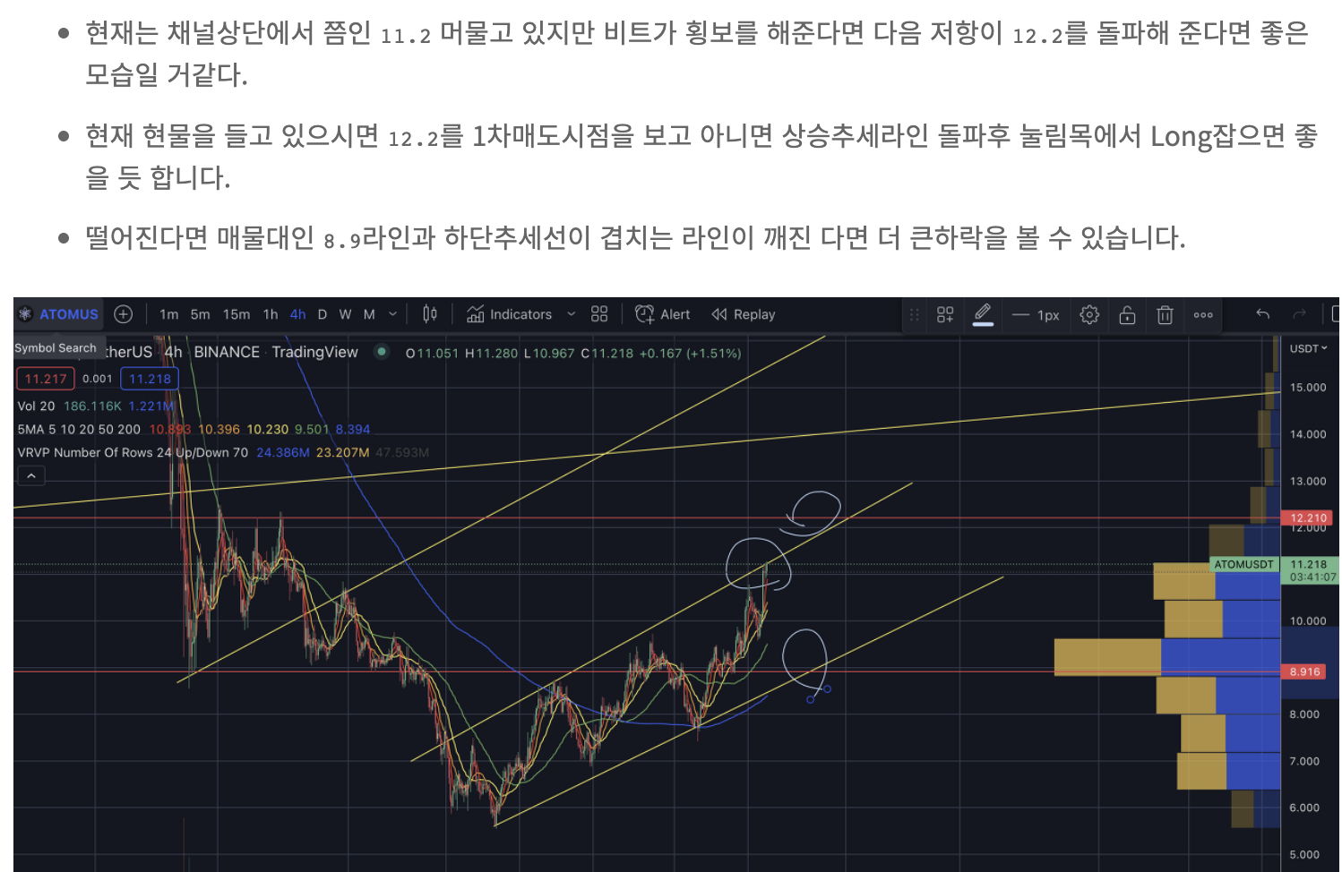 - 두번째 코멘트인 12.2를 넘어서고 매물대인 그 지점을 돌파해서 좋은 모습을 보여주고 있다 --> 오? 맞았어?