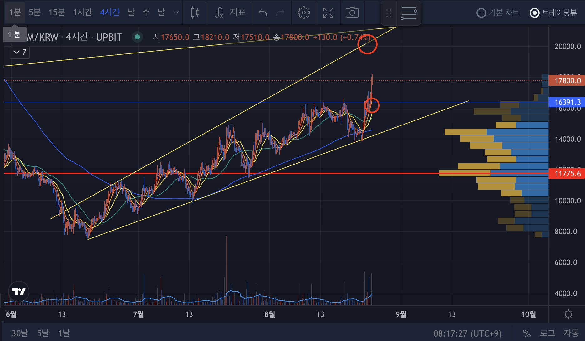 - 업비트 기준으로는 16,300원 자리를 지켜주고 큰 저항은 2만원대이다.