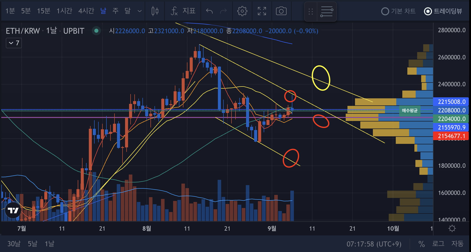 - 노란색원이 21년 11월부터 이어져온 추세선을 깨려고 갔지만 다시 하락하고 있다.
