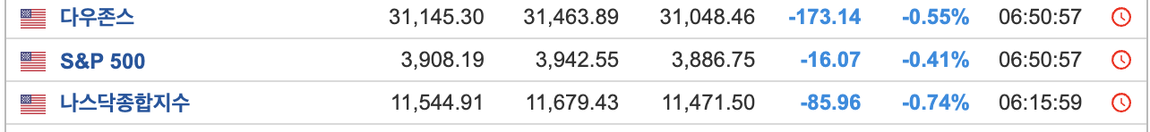 - 3대 지수도 전부 하락했다. 특히 나스닥은 7거래일 연속 하락으로 좋지 않은 모습을 보여주고 있다.