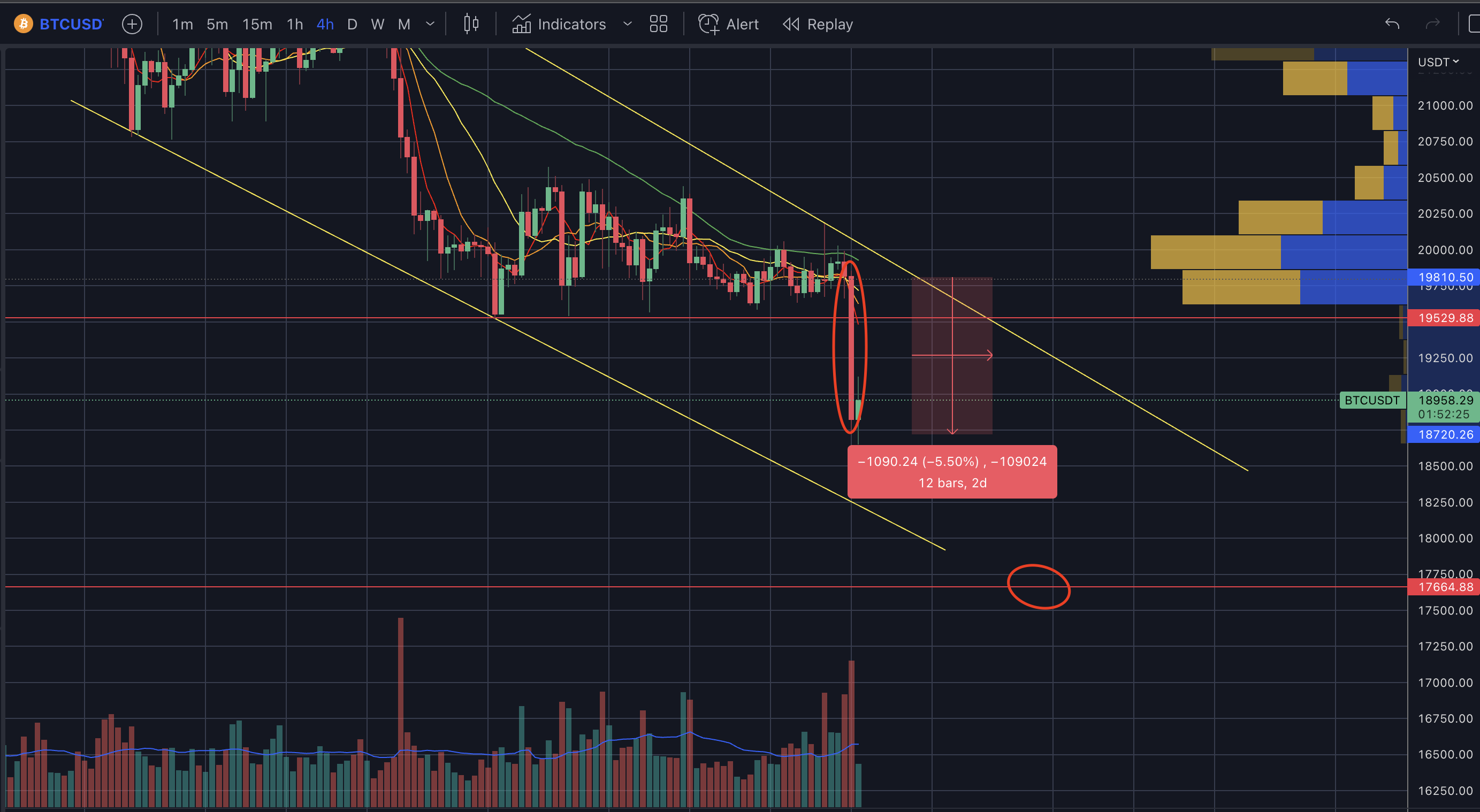 - 21년 11월부터 이어져온 하락은 아직 끝나지 않았다. 쌍바닥을 이끌고 갈지 모르는 상태에서 만약 17.6k을 깨버린다면 14k를 바라 볼 수 있다