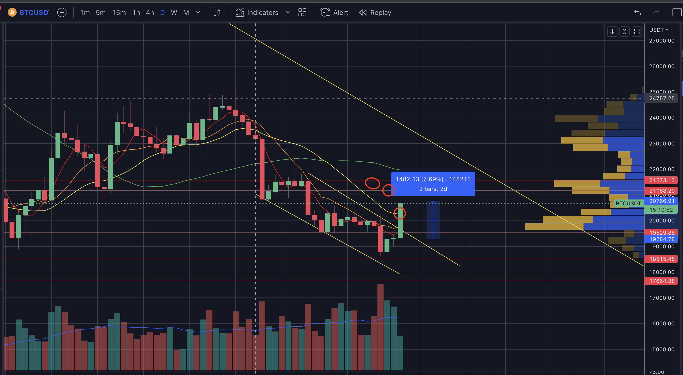 - 20.3k까지 다시 떨어지고 지켜주면 좋은 매수자리가 된다.