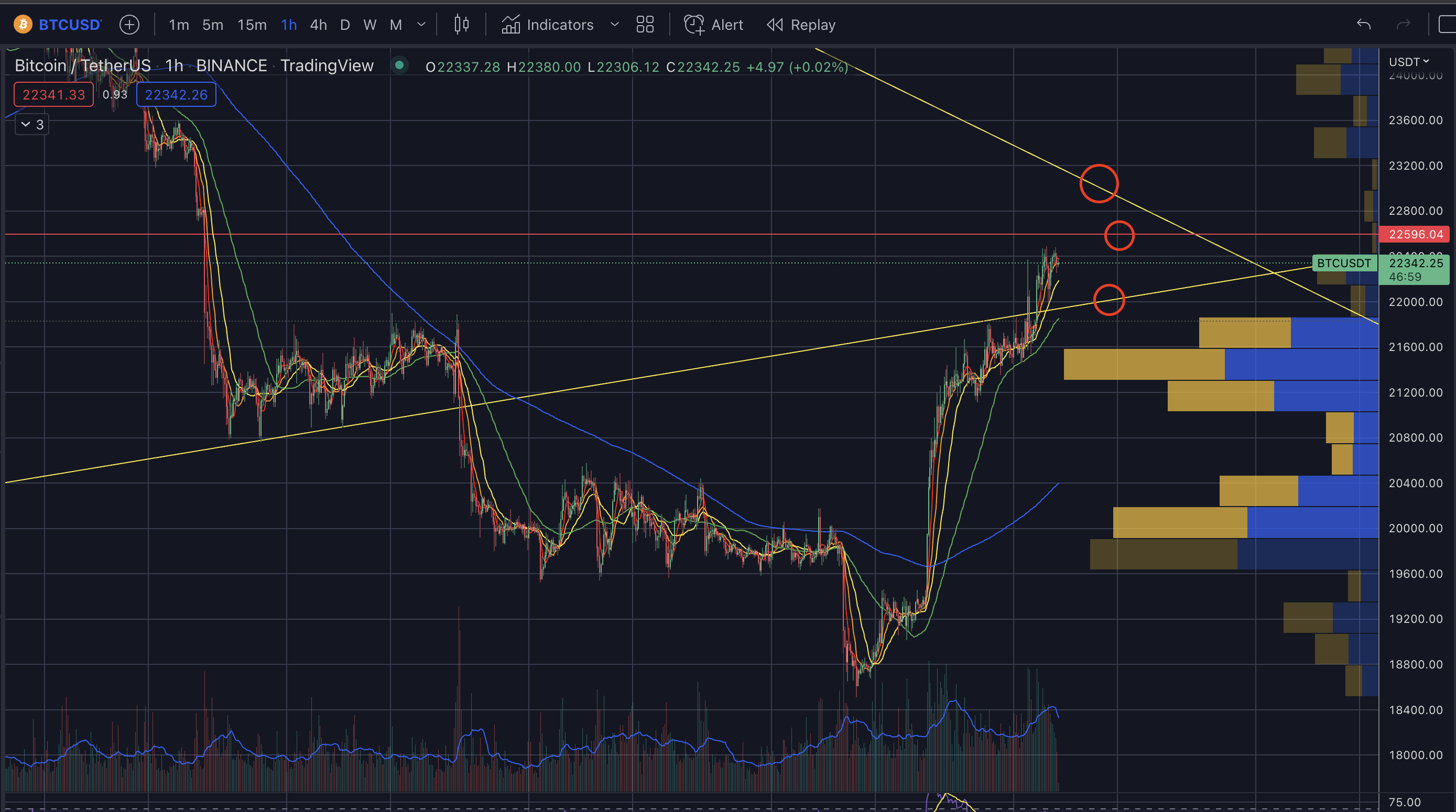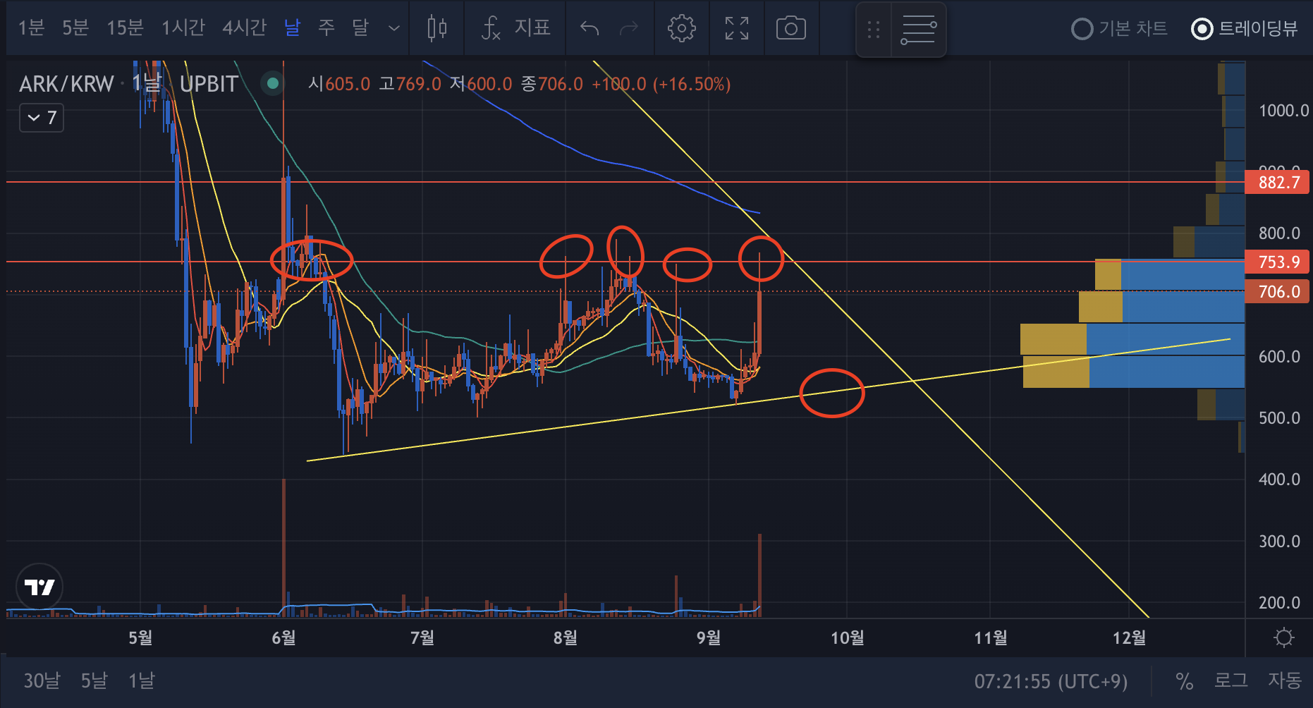 - 22.5~6k 라인과 상단 추세선을 강하게 뚫는 것을 잘 지켜봐야 한다.