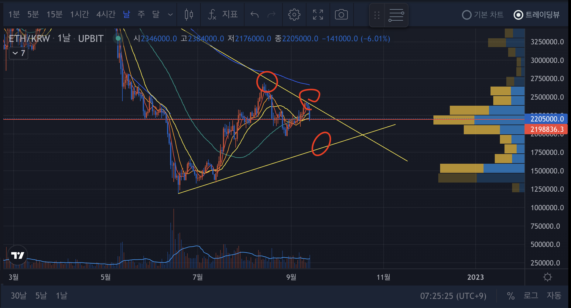 - 비트와 마찬가지로 21년 11월부터 이어져온 추세선과 6월 저점선이 삼각수렴 형태를 이루고 있다.