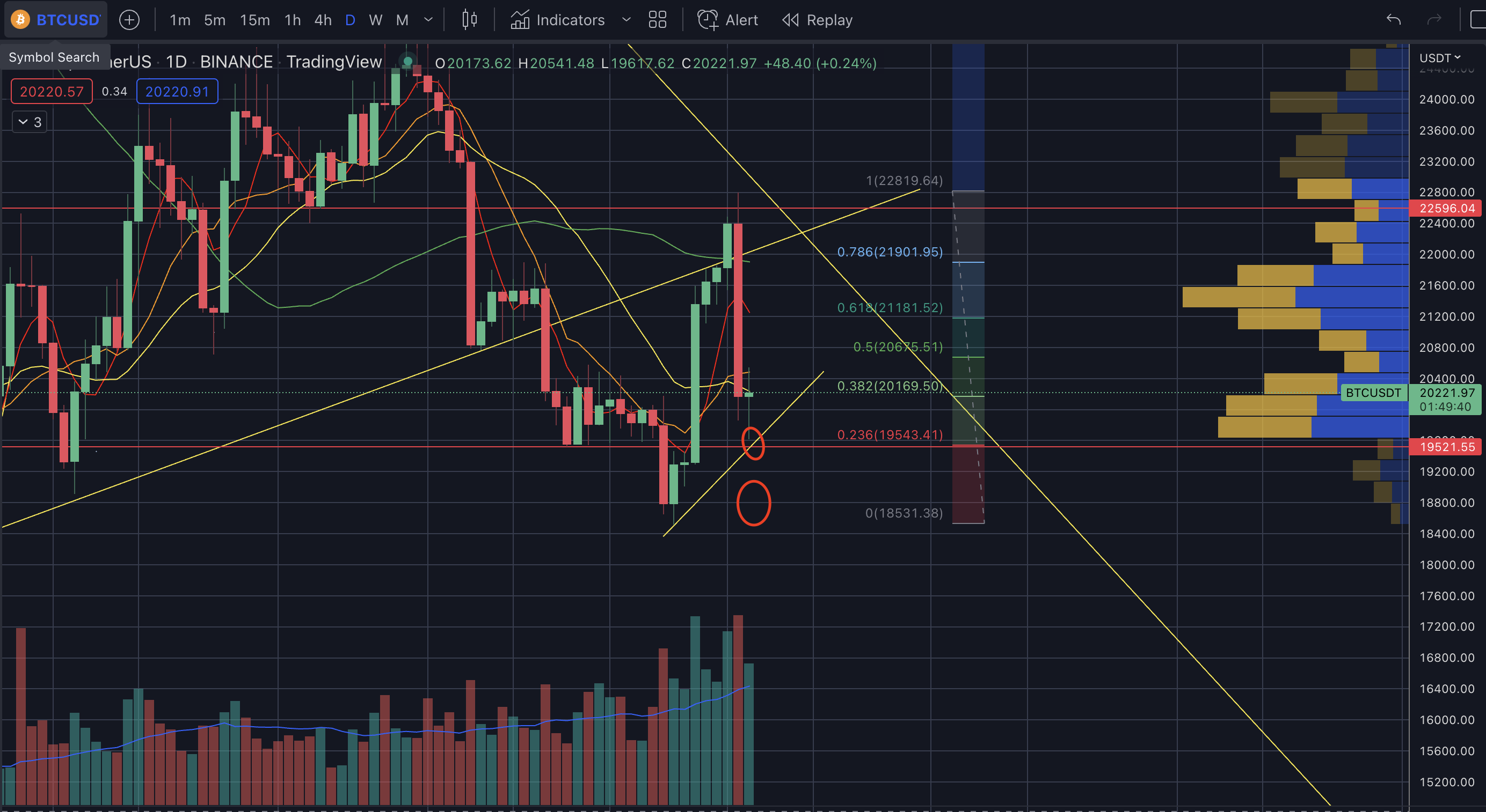 - 20일선과 0.382라인인 20.1~2k을 넘어 상승하게 된다면 21k 부근까지 상승 가능하다.
