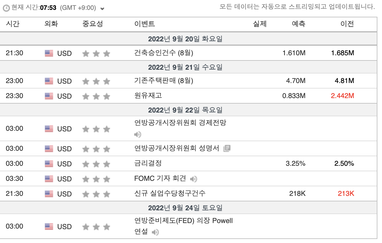 - 이번 주 9월 22일 목요일 03:00 금리 결정이 있다.(75bp 예상 82% / 100bp 예상 18%)