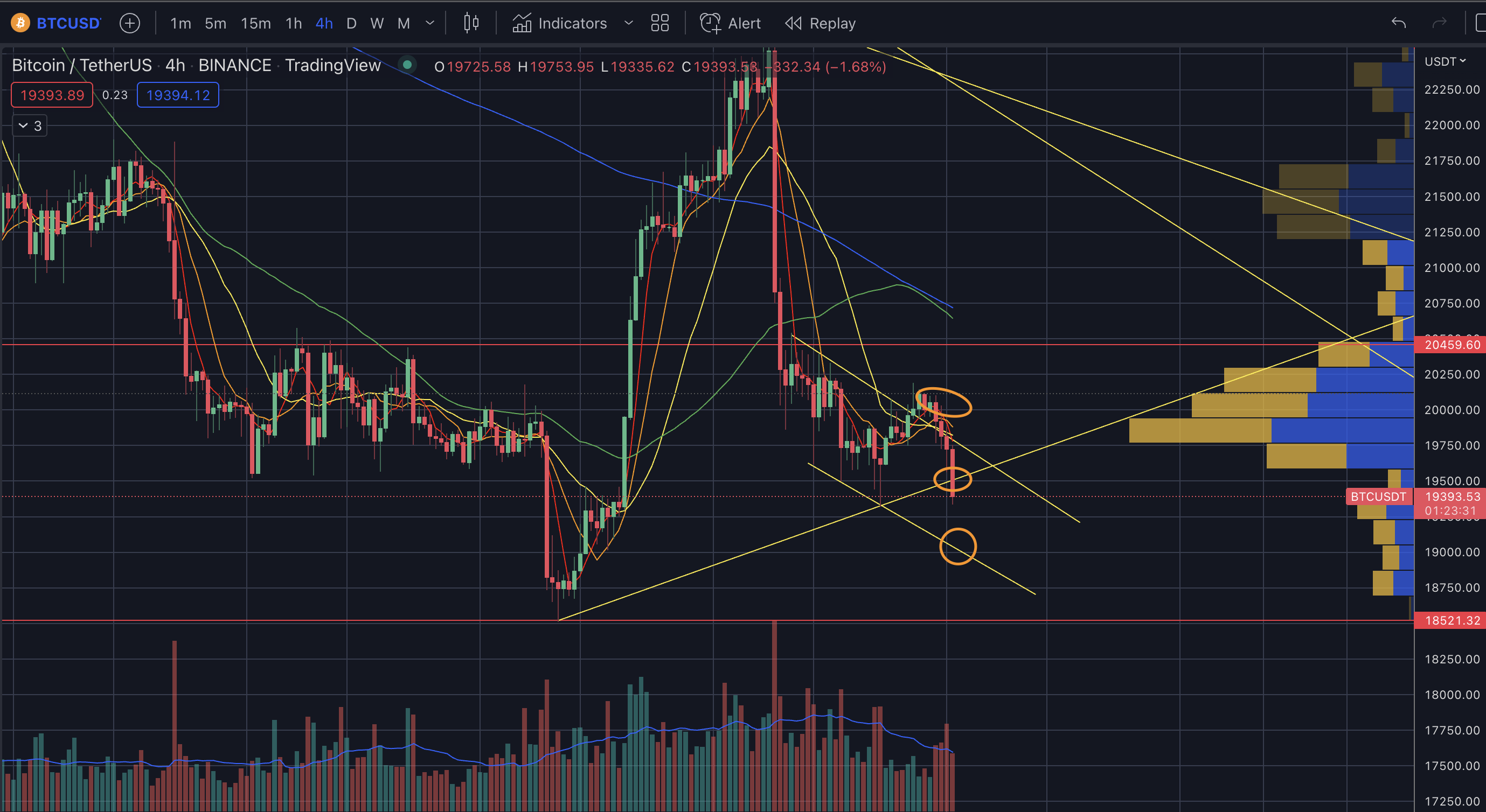 - 추세선이 아직 4시간 봉이 끝나지 않았지만 19.5K 위에서 회복해주지 않으면 하락 가능성이 높다.