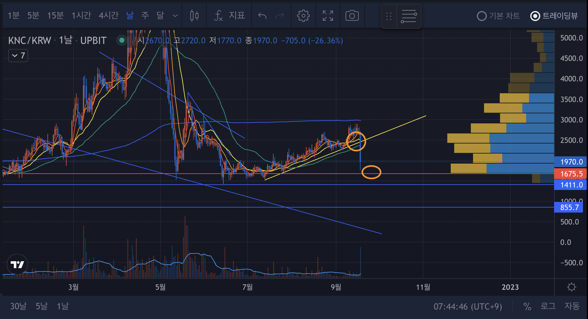 - 비트코인의 흐름에 반대하여 힘이 좋았던 흐름과는 달리 추세선을 한 번에 뚫려버리면서 마지막 매물대였던 1750원까지 떨어졌다.