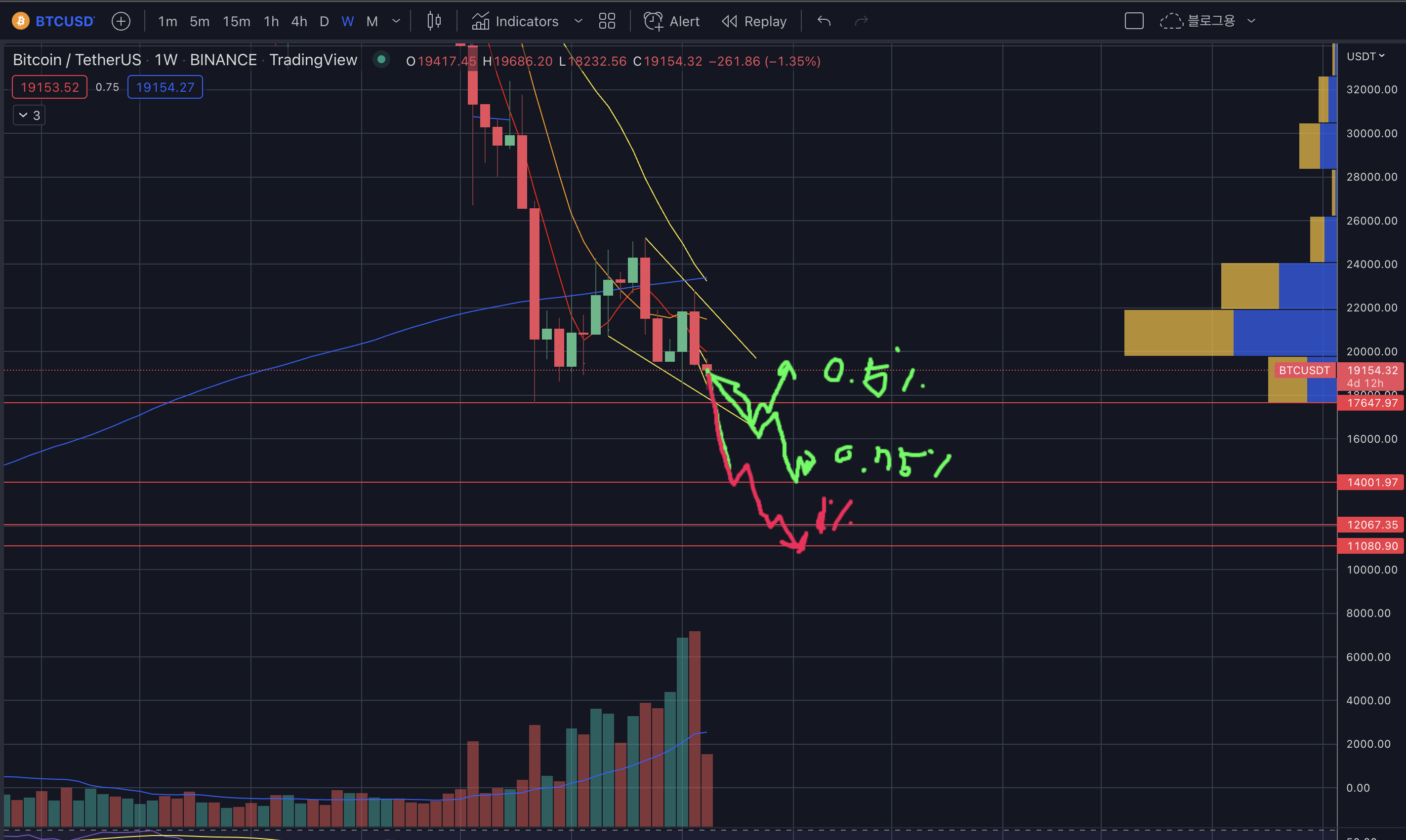- 금리 0.5%(빅스텝) : 18k정도 간다음 반등 -> 다시 17.6k 부근 와서 W 상승 가능(큰 양봉 필요)