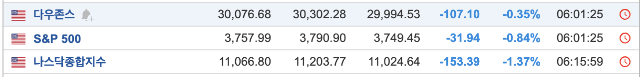 - 자이언트 스텝 이후 장은 여전히 좋지 않아 3대 지수 모두 떨어졌다.