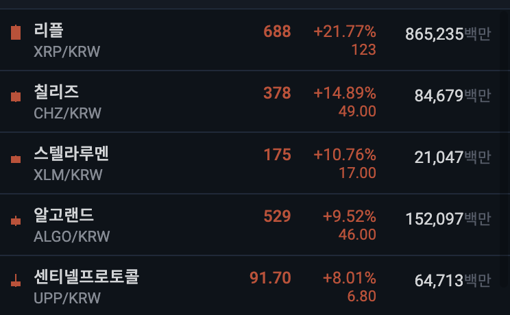 업비트 전일 대비 상위 종목
