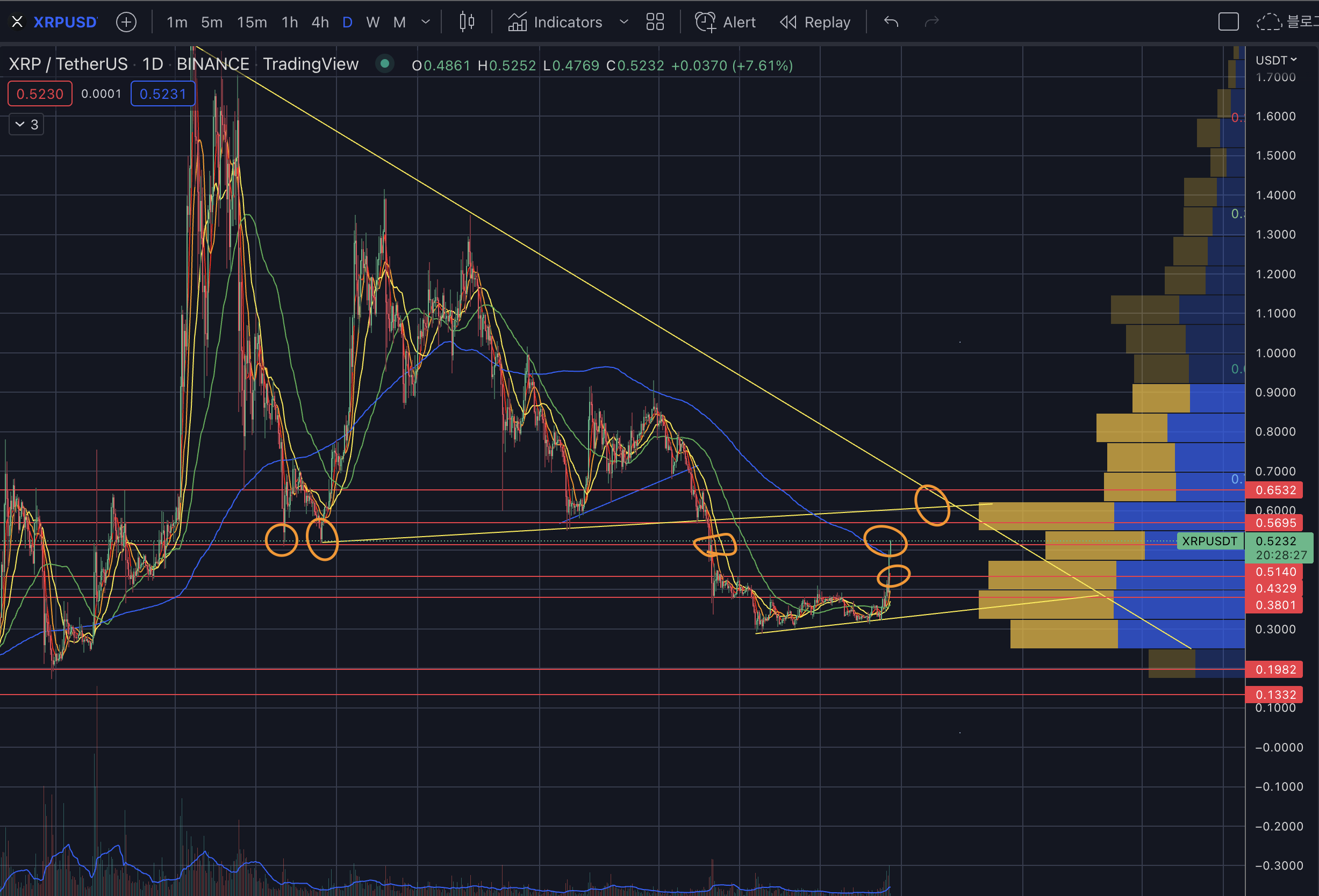 - 현재는 매도 타점임며 오른 다면 0.569 -> 0.58 -> 0.6 -> 0.653 순으로 저항선이 있다.