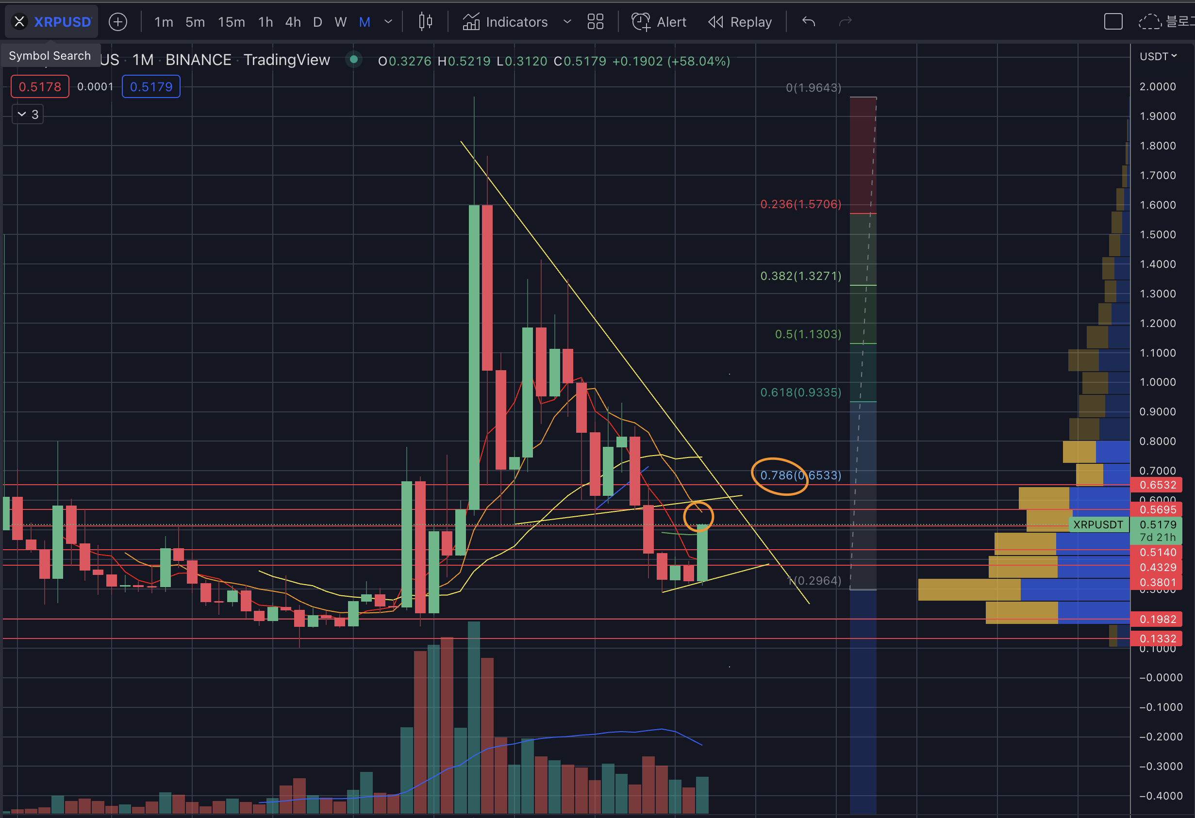 - 21년 3월부터 이어져오 피보나치로 보면 $0.653(0.786라인) 라인이 최대 저항대로 보인다.