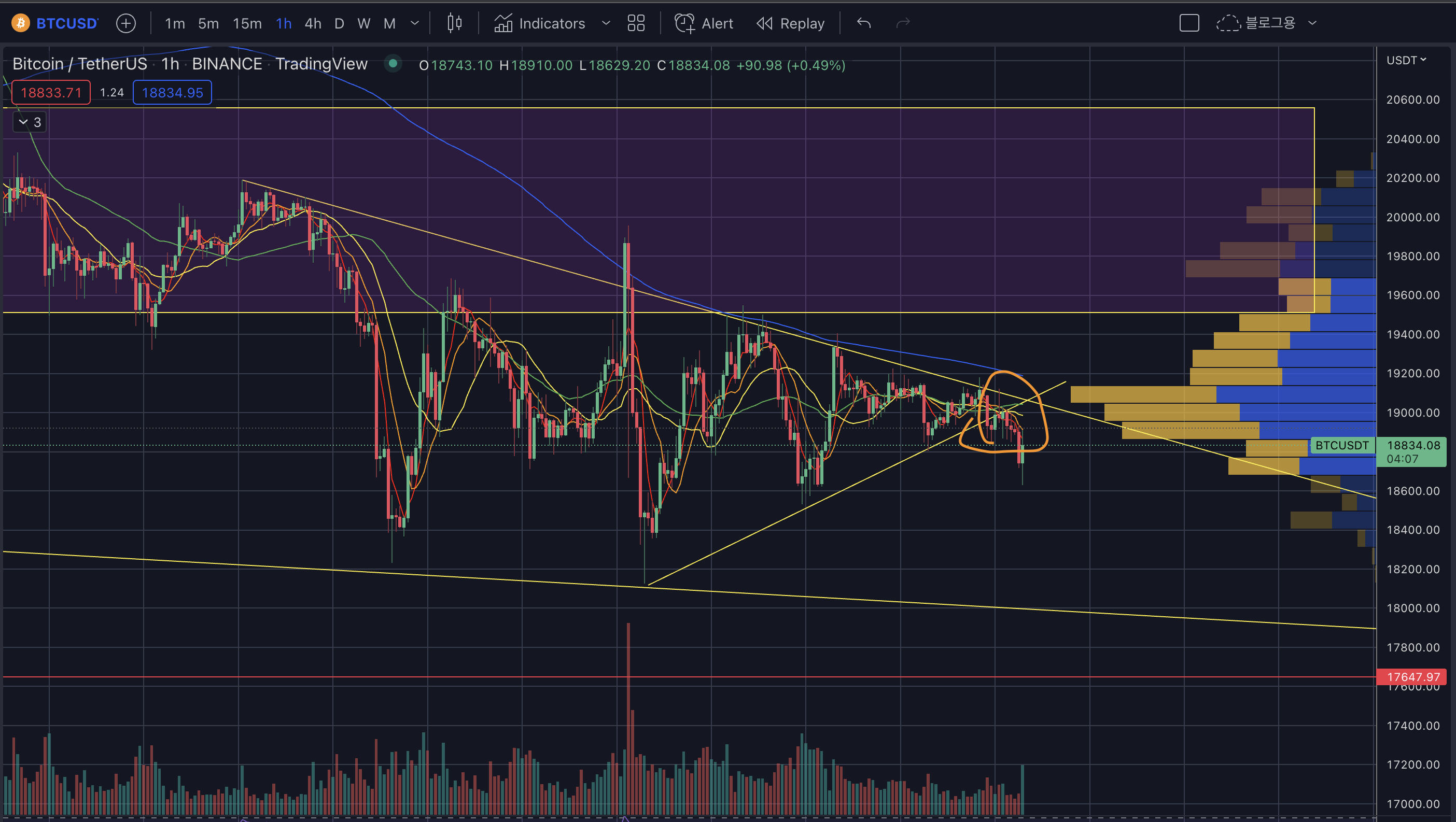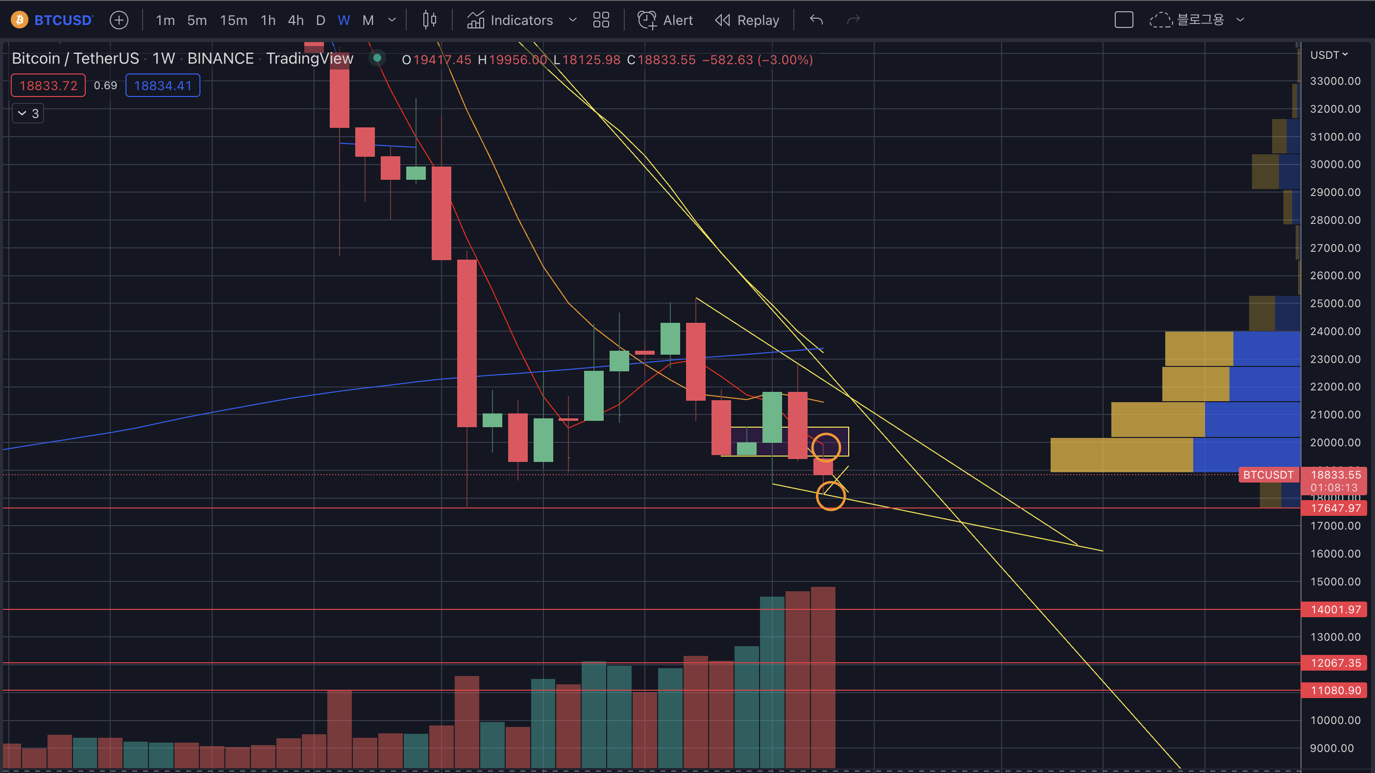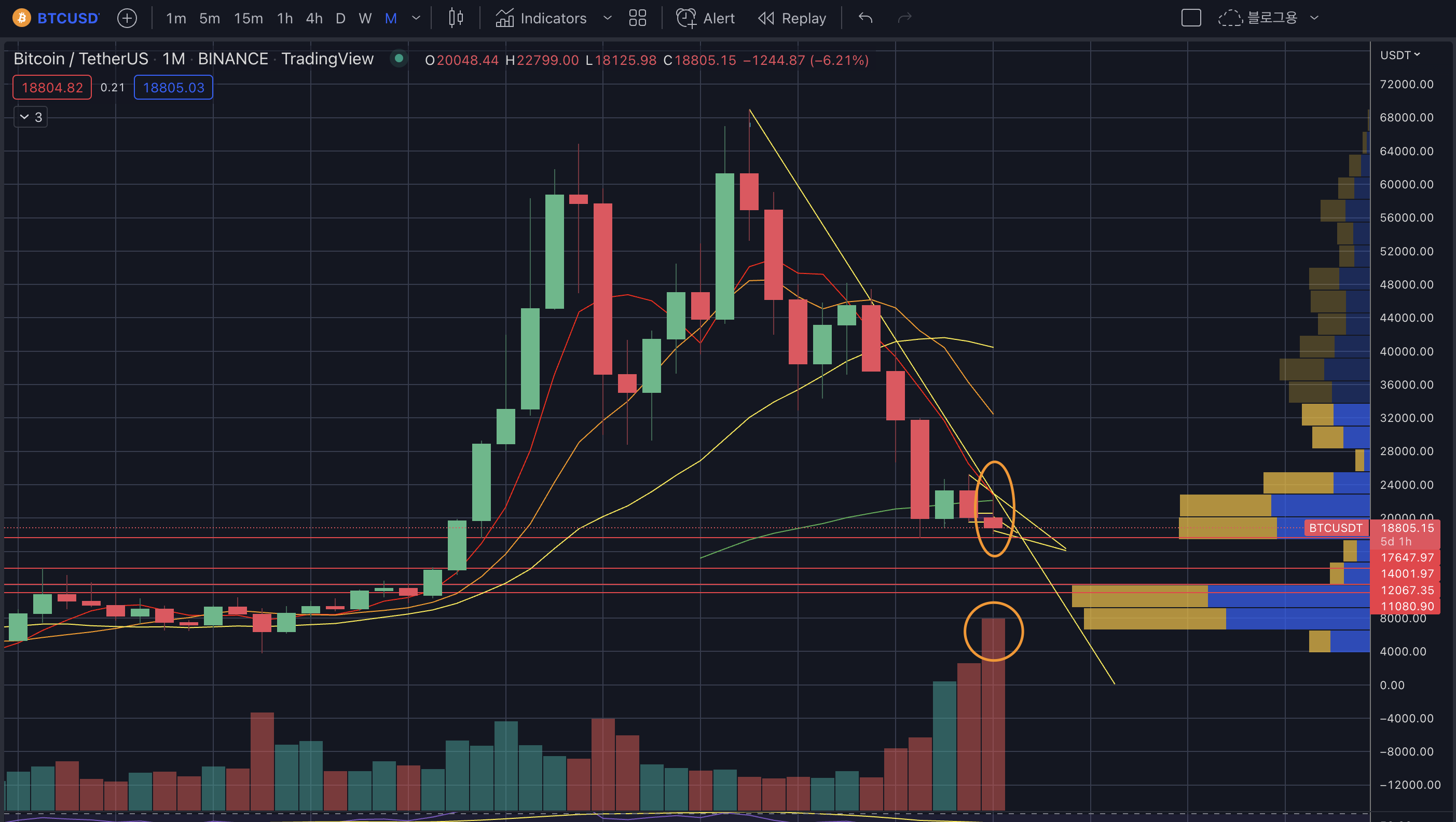 - 17k~22k 구간이 많은 매물이 있는 곳인데 아래로 떨어지고 전저점을 깬다면 다시 이 매물대를 뚫기가 쉽지 않다.