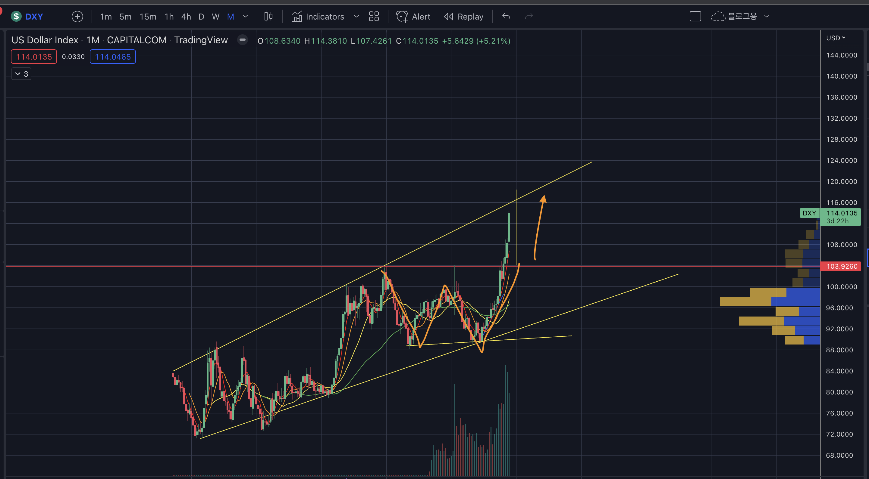 - W 패턴을 그리면서 103의 저항을 뚫으면서 07년부터 이어져온 추세선과 맞닿을 기세이다.