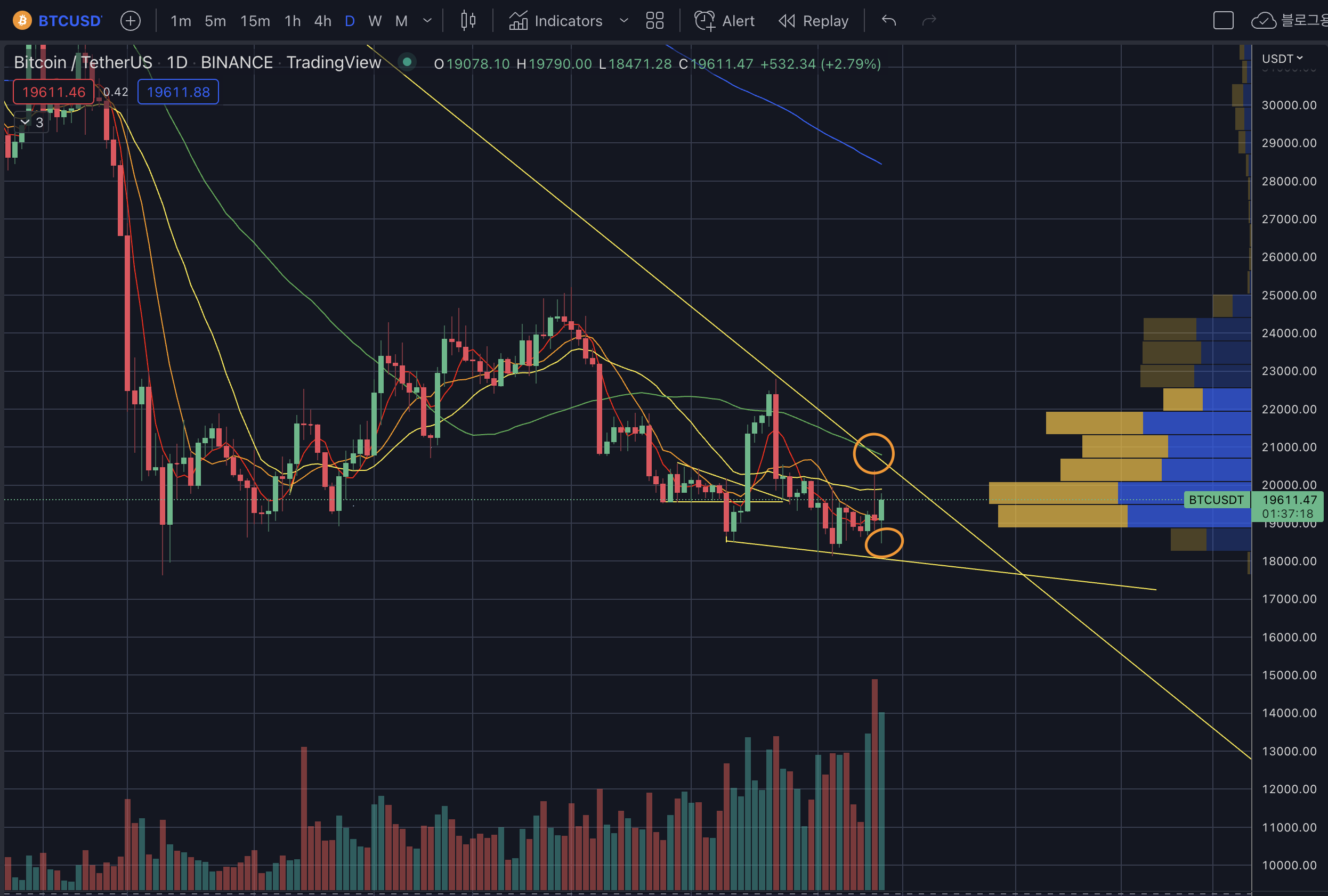 - 상승 시 저항 구간 : 19.5k -> 20.4k -> 20.8k -> 21.2~3k -> 22.5~7k
