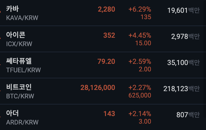 - 카바, 아이코 느 쎄타 퓨엘, 비트코인, 아더가 좋은 모습을 보이고 있다.