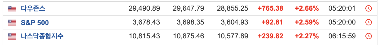 - 3대 지수모두 엄청난 상승을 보여주면서 지속적 상승의 희망을 보여줬다.(여기도 아직 아님..)