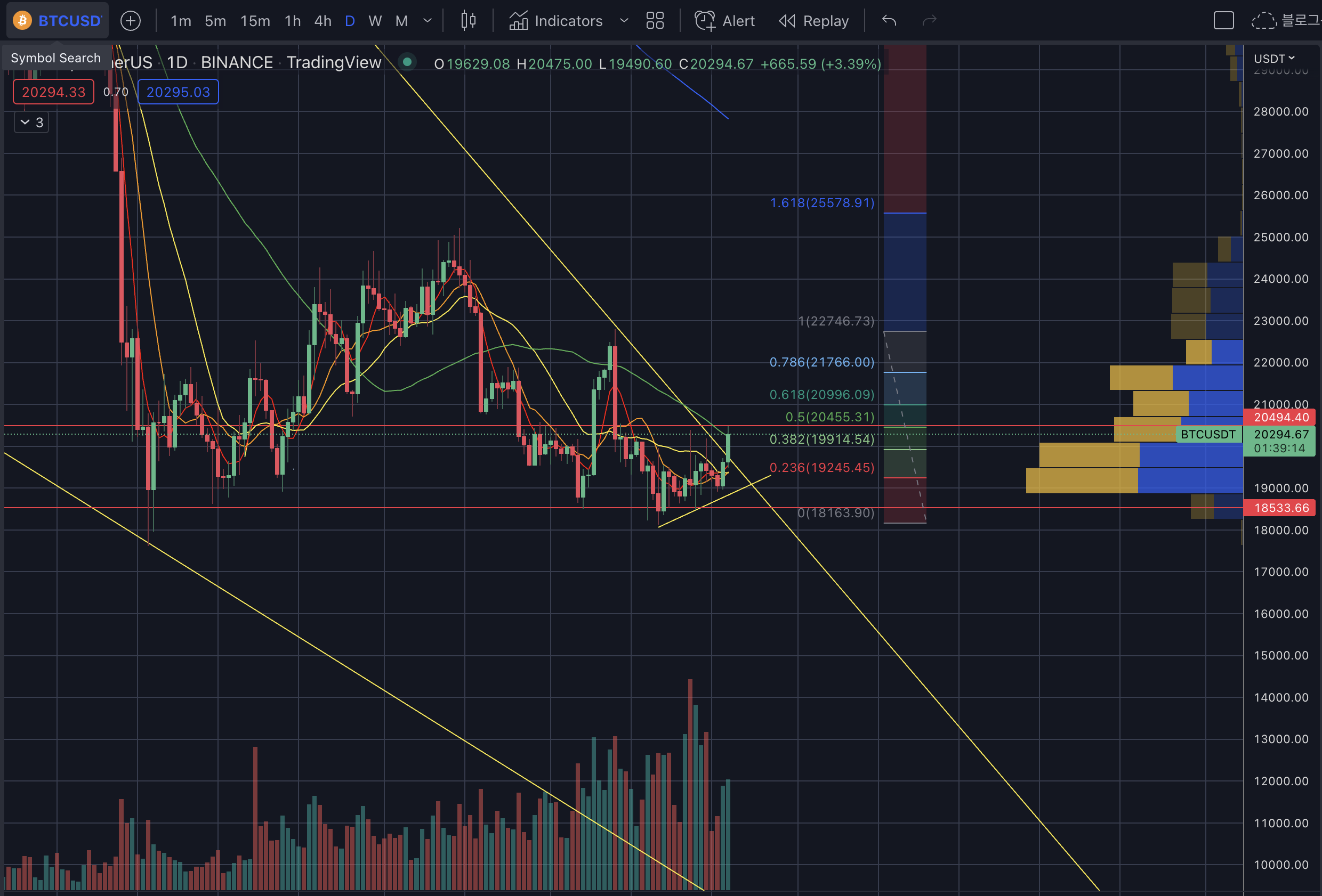 - 20.4k*라인은 CPI쇼크떄 떨어진 시점과 18k까지의 피보나치인 0.5라인, 월봉의 5일선, 강한 매물대가 겹치면서 강력한 저항선으로 보고 있다.