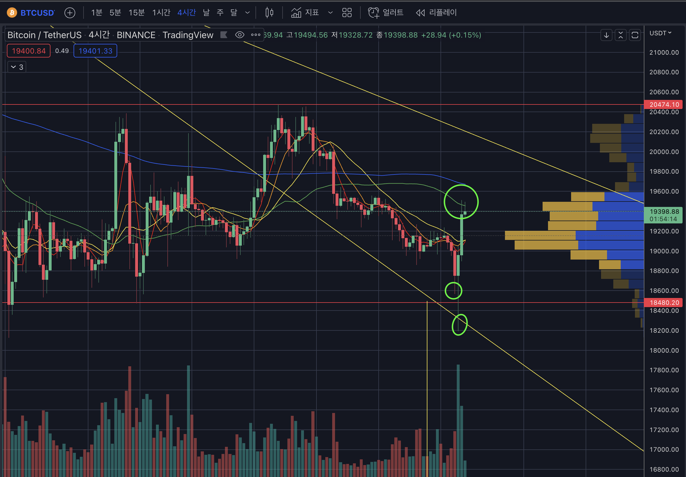 - 현재는 19.5k 단기 저항에 막혀 주춤하고 있다.