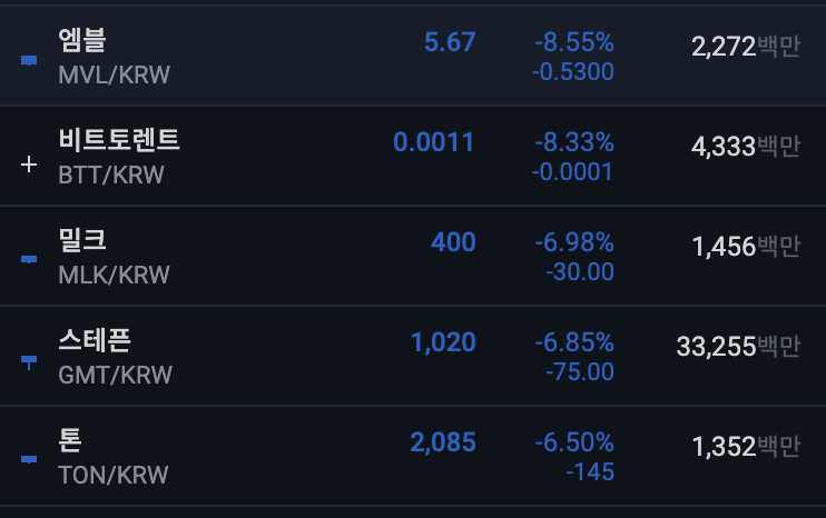 업비트 전일 대비 하위 종목