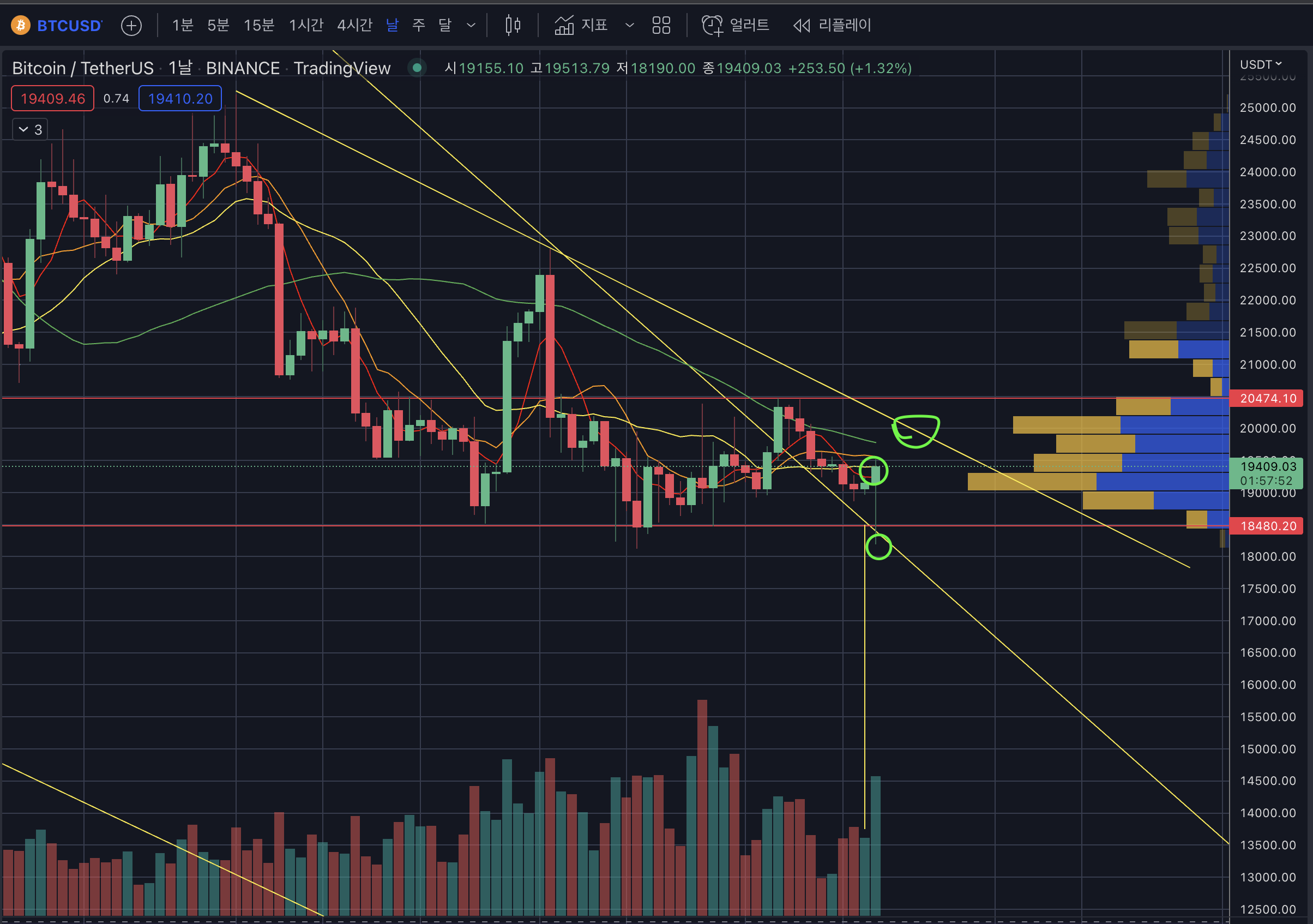 - 18.5k ~ 20.5k박스권에서 벗어나야 한다. (이 부분은 엄청 많은 물량이 있다.)
