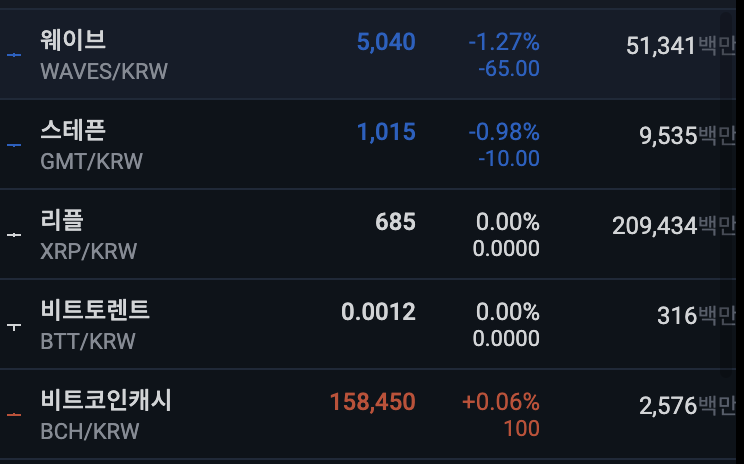 업비트 전일 대비 하위 종목