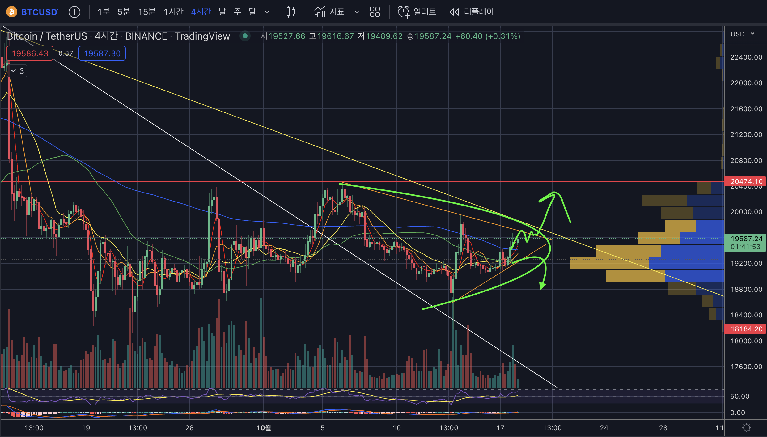 - 하지만 아직 강력한 매물대인 20.5k를 뚫지 못했기 때문에 완전한 상승은 아니라고 본다.