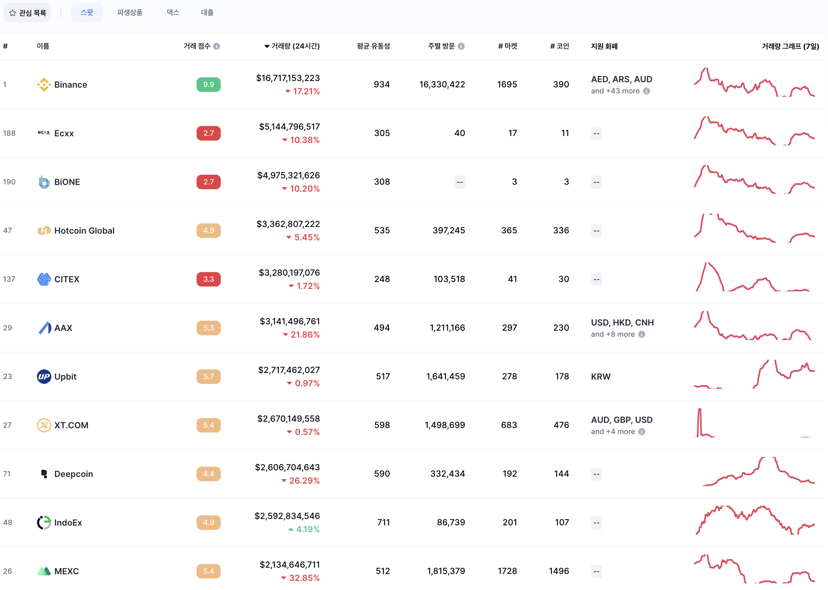코인 마캣 캡 기준으로 전 세계에 엄청 많은 거래소들이 있다. 코인마켓 캡에서 제공하는 거래 점수에 따른 현물(SPOT) 거래소 목록입니다.