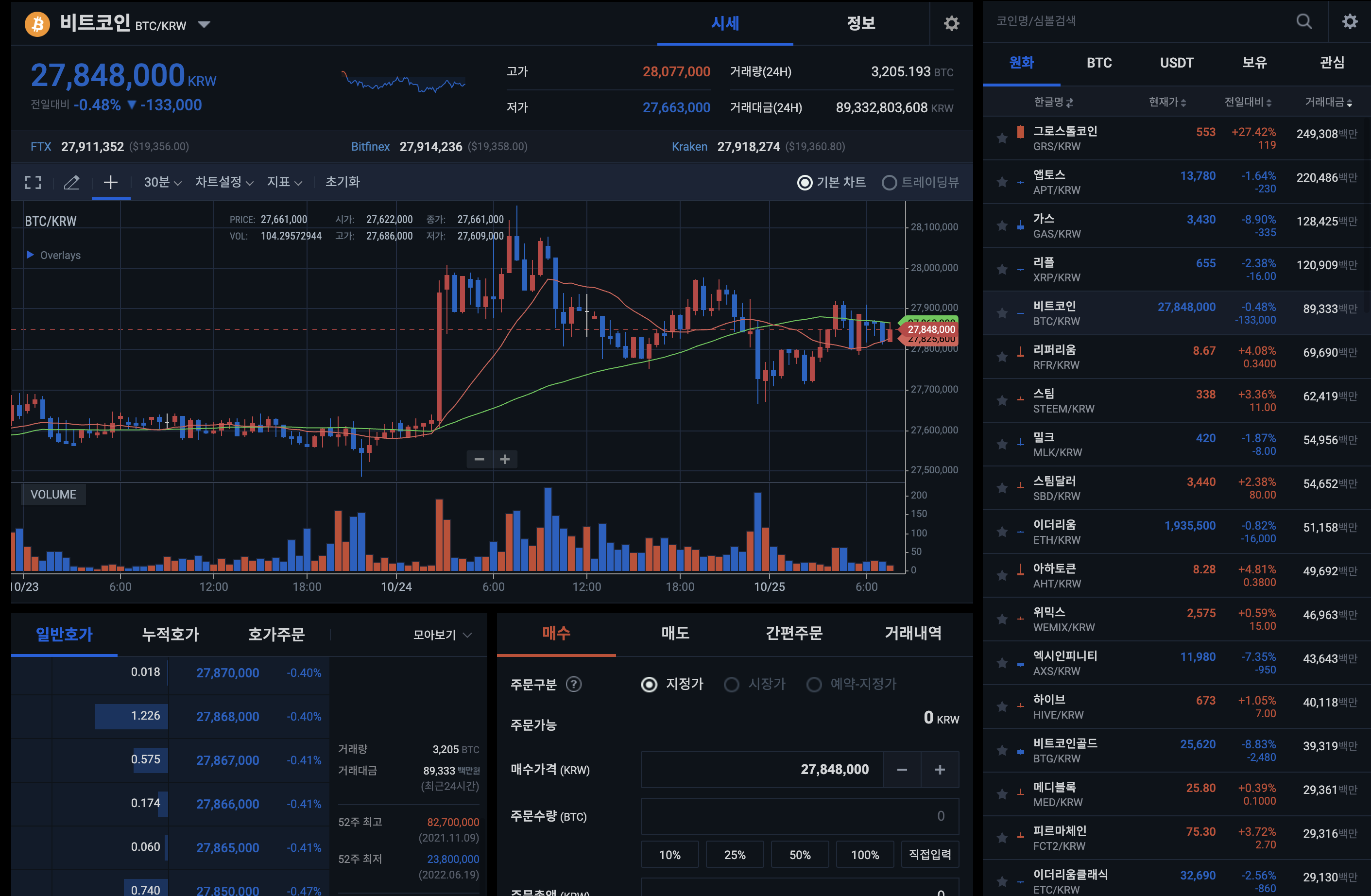 높은 수수료 : 선물의 저배 레버리지에 비해 수수료가 세다는 점입니다. 그리고 거래량이 선물에 비해 적어서 단타를 치기 쉽지 않다.