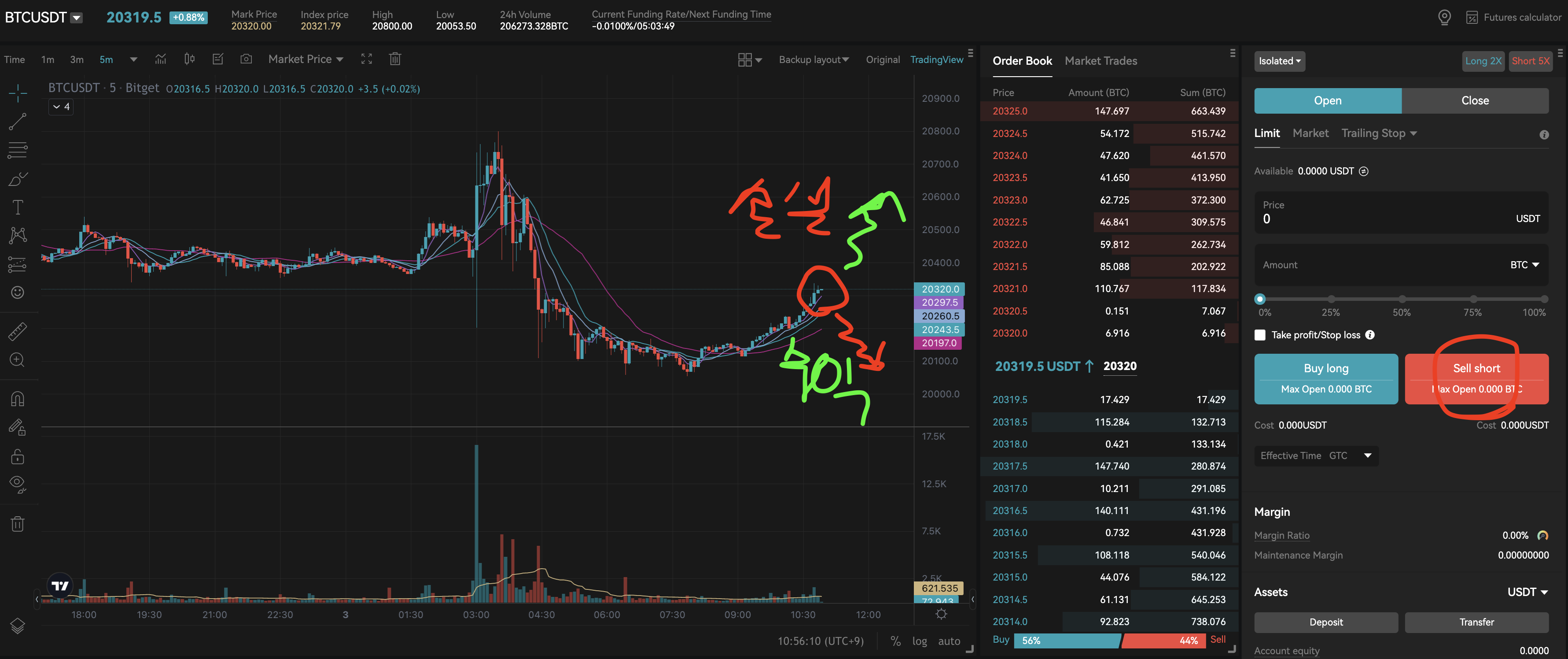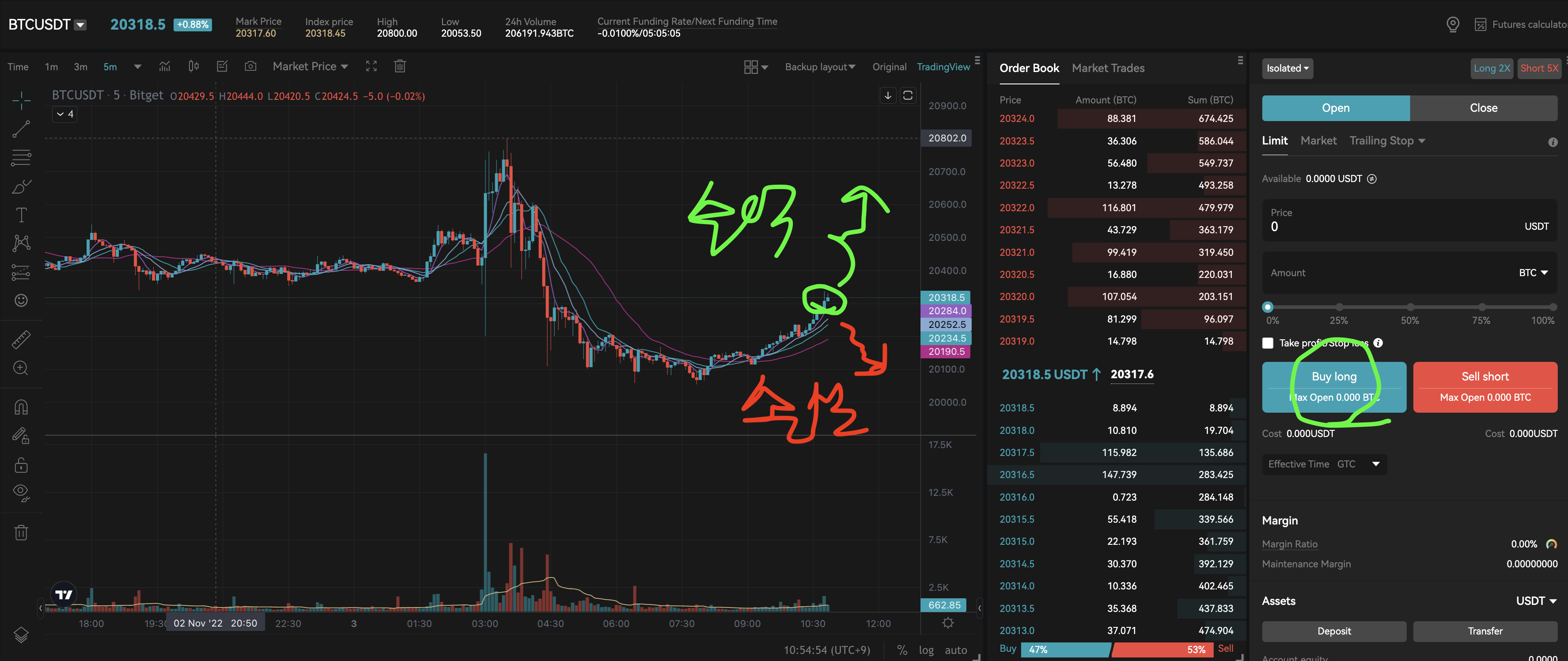 비트코인에서 롱포지션(Long Position)은 현물에서 코인을 매수하는 것과 비슷합니다. 금액이 상승하는 것에 대해 매수하는 것을 말합니다. 아래 그림에서 만약 20318에 Long을 진입했다면 떨어지면 손실을 오르면 수익을 얻게 되는 포지션입니다.