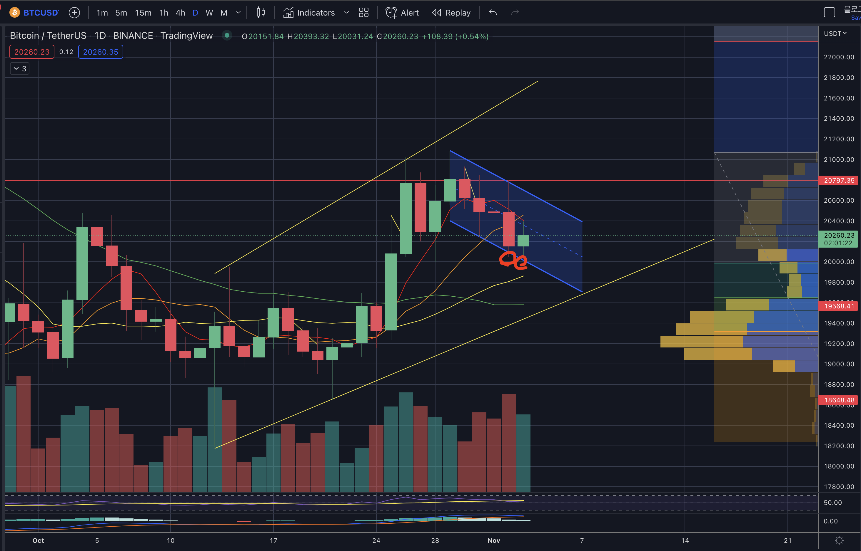 - 상승한다면 단기 하락 채널을 뚫고 20.8k~21k를 뚫을 때까지 기다리는 것이 단기적으로 흐름이 상승으로 가는 것입니다.