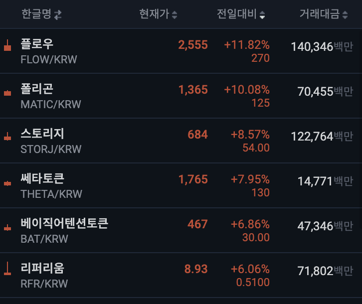 업비트 전일 대비 상위 종목