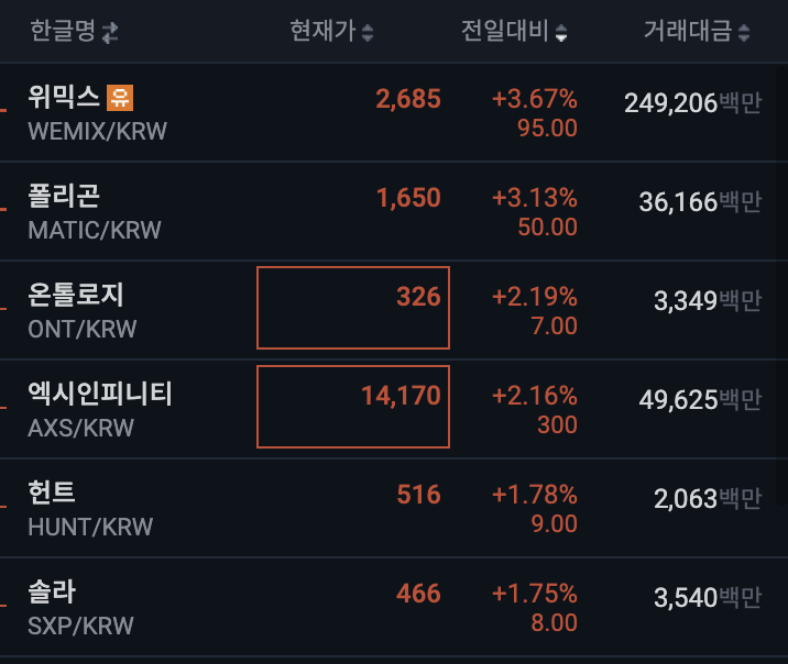 - 업비트 전일 대비 상위 종목