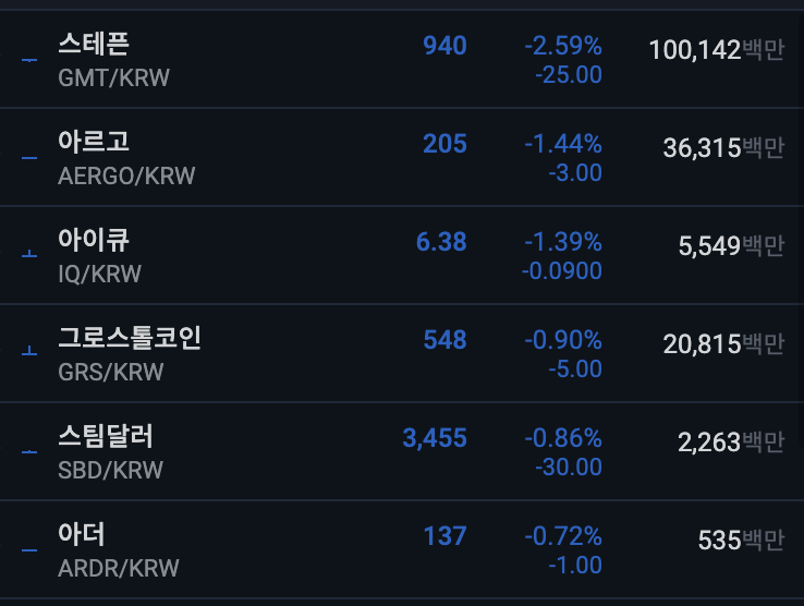 업비트 전일 대비 하위 종목