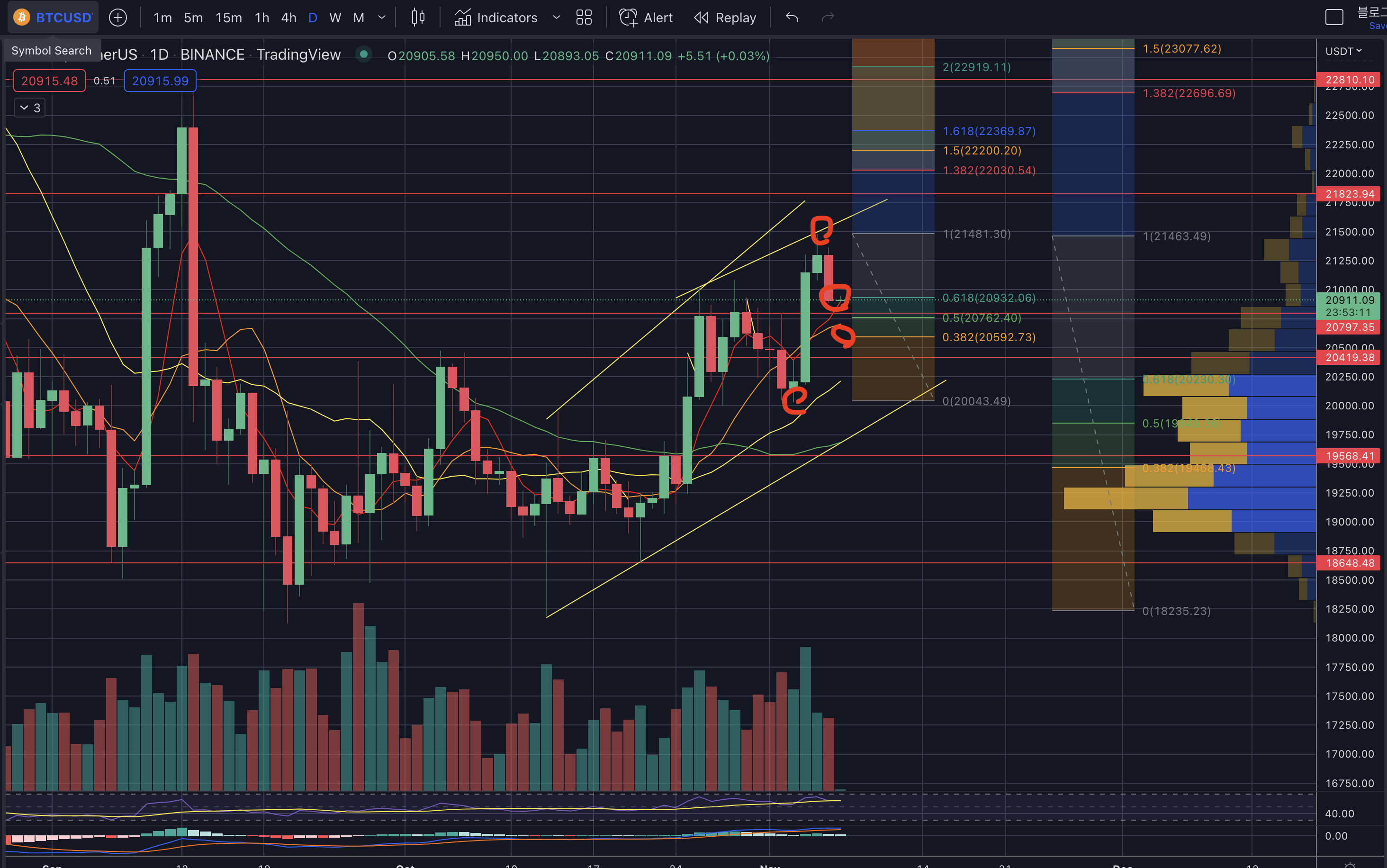 - 하락 시 지지 구간 : 20.8k -> 20.5k -> 20k -> 19.7~8k