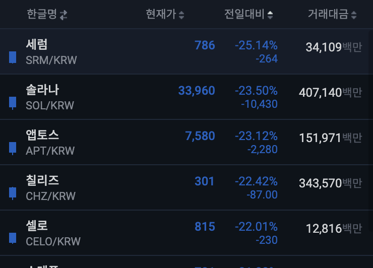 - 세럼, 솔라나가 직접적인 FTX피해를 보았기 때문에 많은 하락을 하고 있다.
