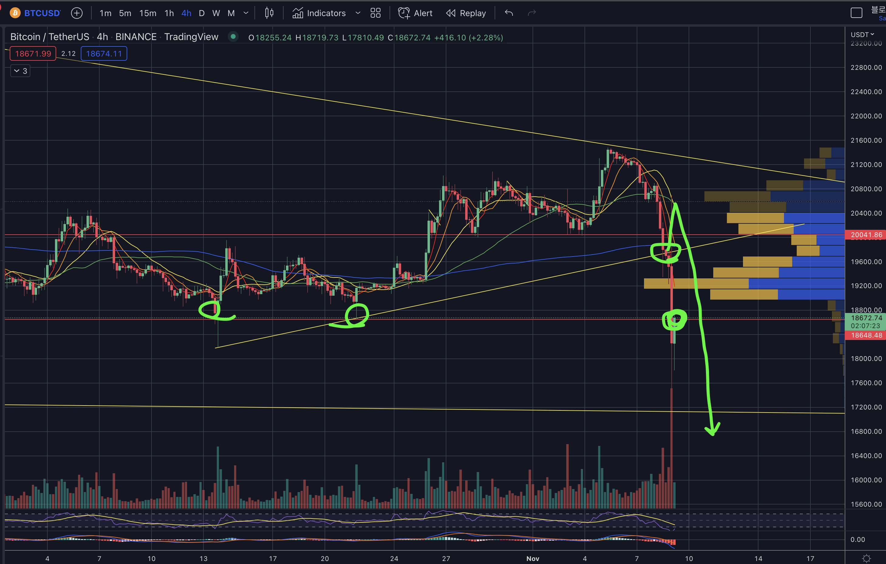 - FTX 뱅크런 사태와 바이낸스의 인수선언으로 비트코인이 바로 뚫려버렸다.