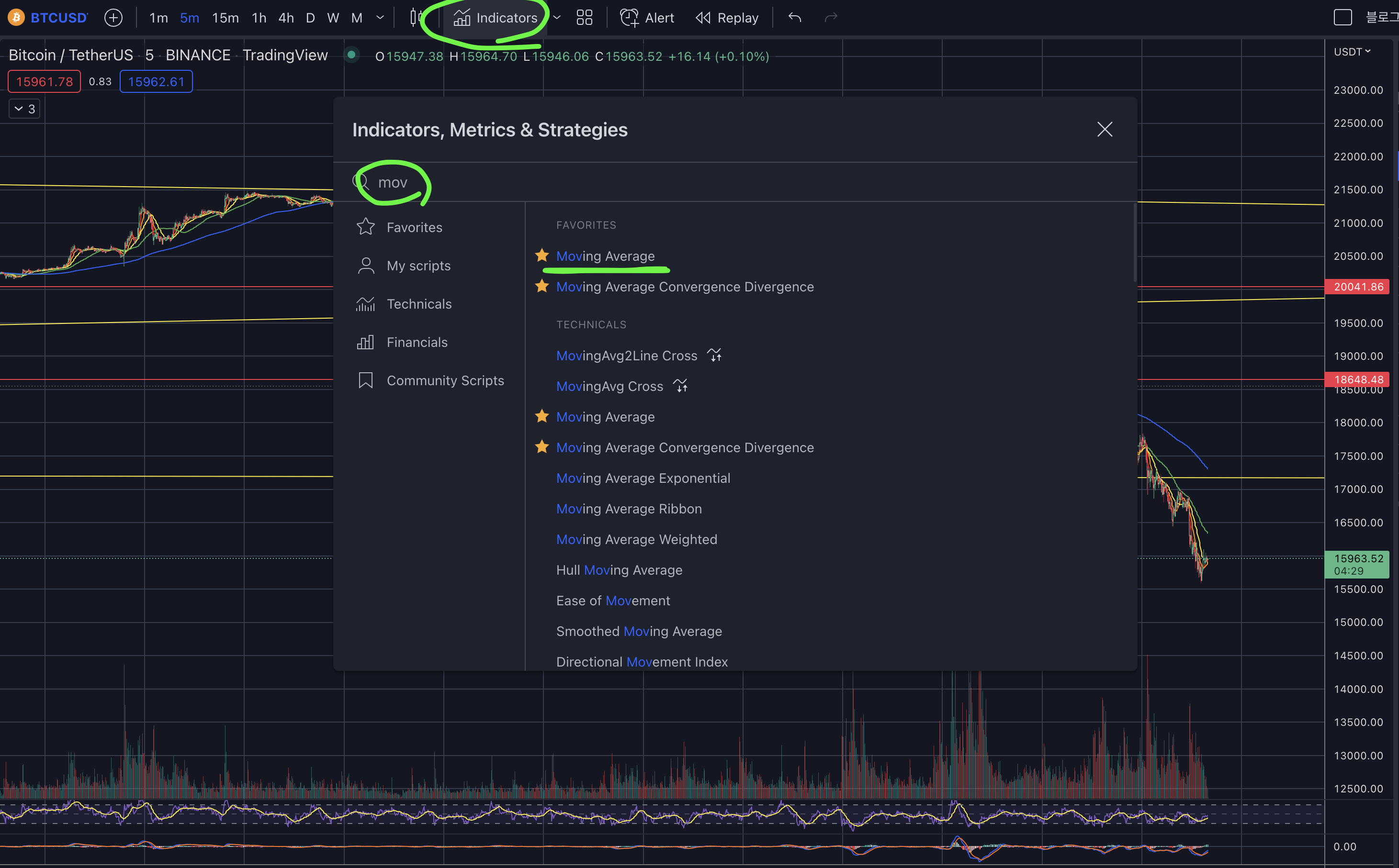 1. indicator를 클릭하고 이동평균선(moving Average)를 선택합니다.
