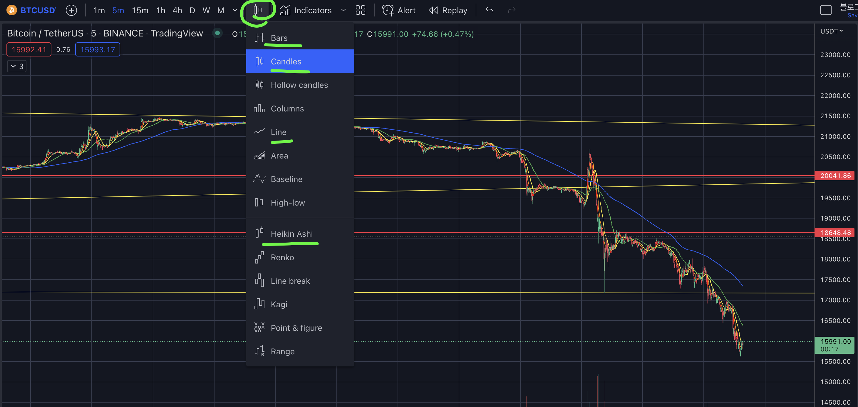 위쪽에 캔들모양의 아이콘을 클릭하면 모양을 선택할 수 있습니다. 만약 초보자라면 대다수가 사용하는 캔들을 선택해서 보시면 되겠습니다.