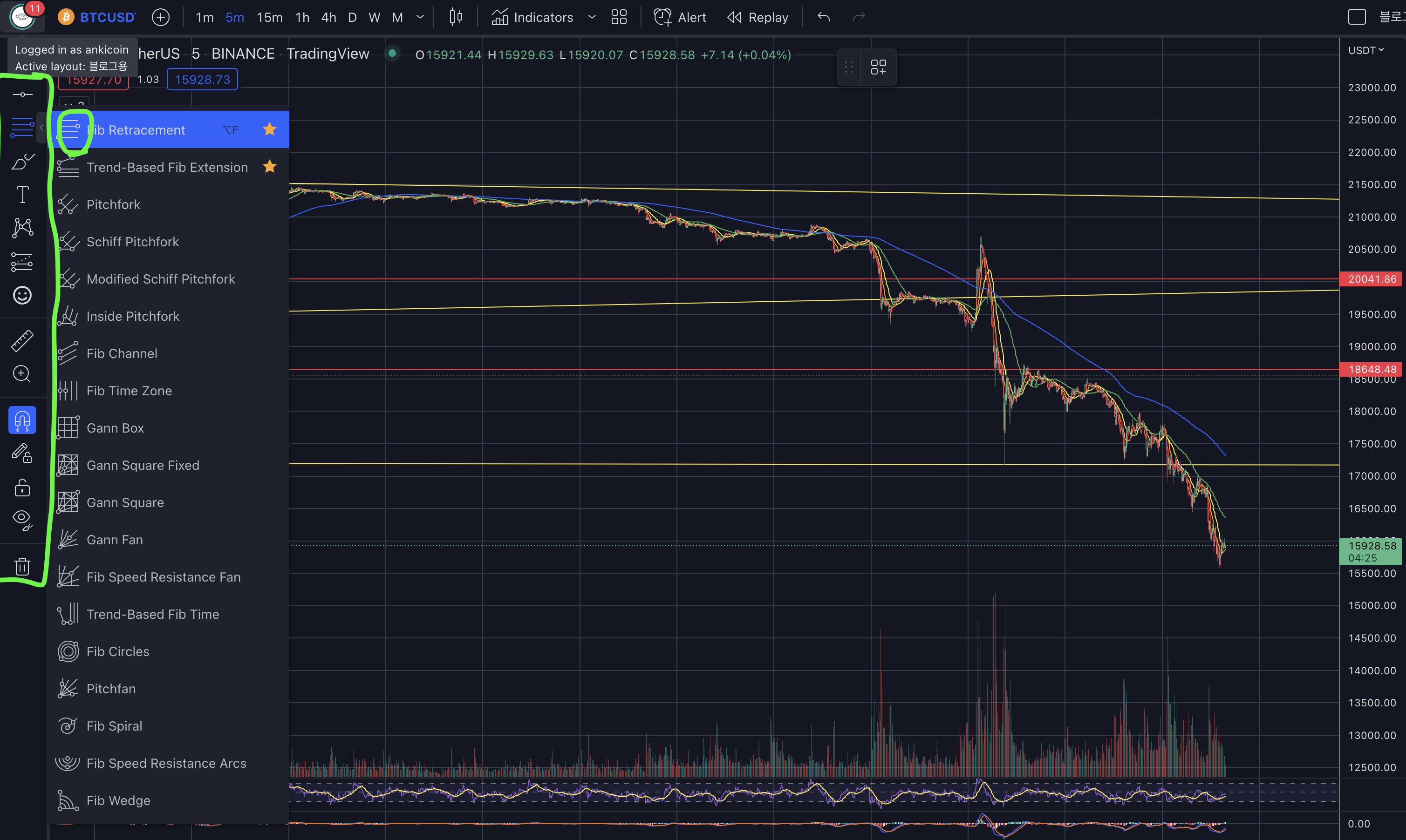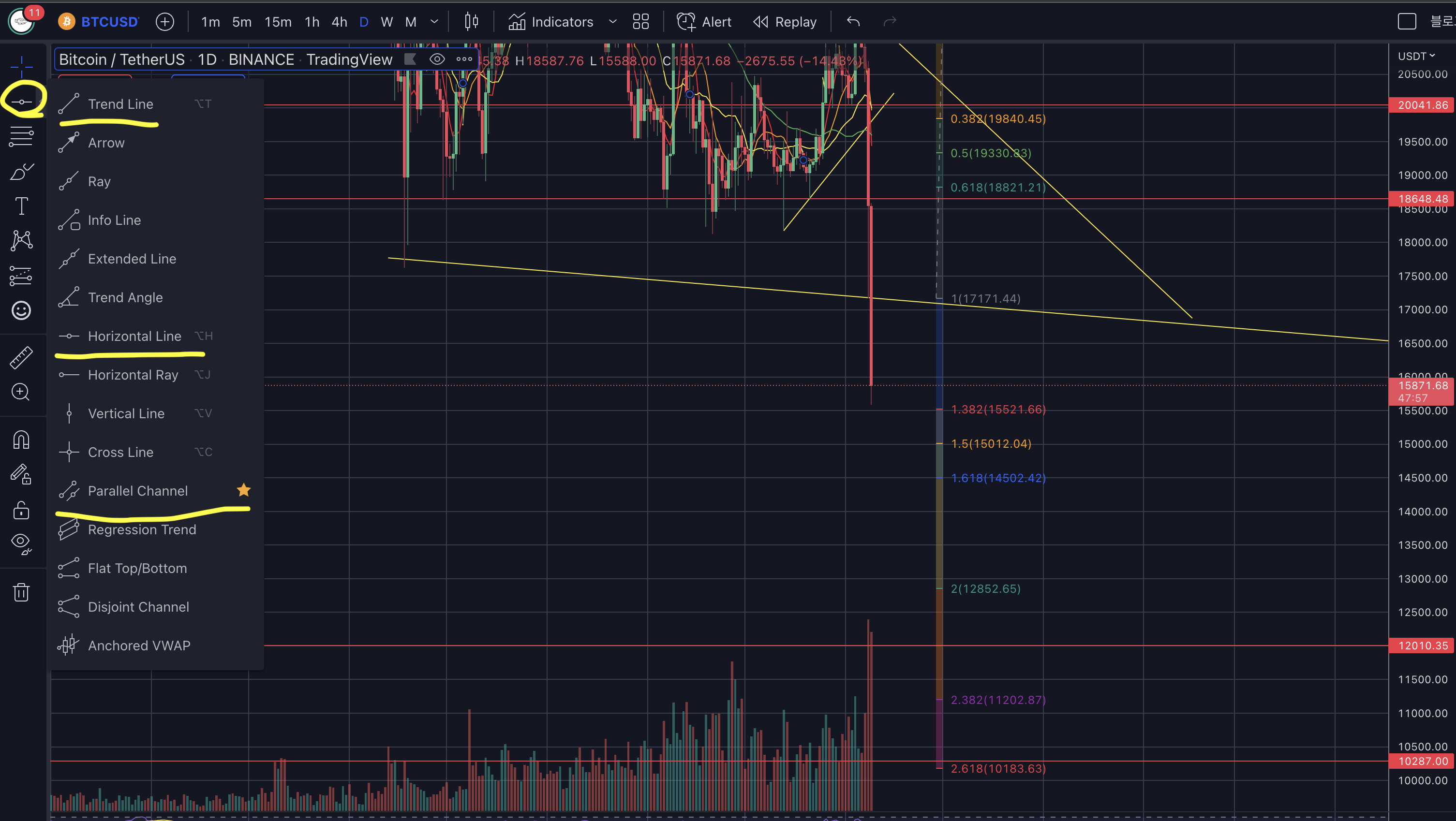주식이든 코인이든 차트가 있으면 거기에 차트 분석 툴이 있습니다. 대부분 많이 내장되어 있는 소프트웨어는 트레이딩뷰로 사용하고 있습니다.